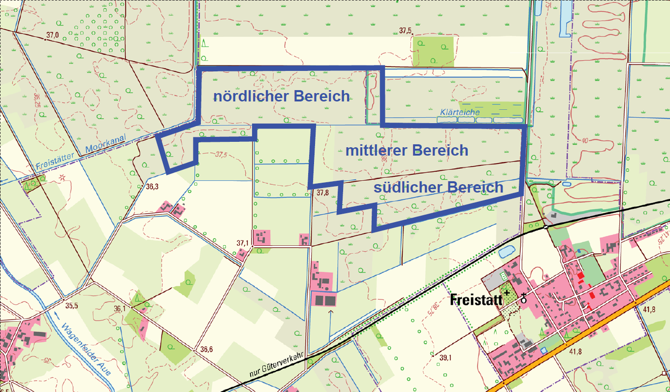 Im Einzelnen sind dafür Gehölzentfernungen zur Baufeldräumung und Herstellung des Offenlandcharakters erforderlich. Im Bereich der Wasserregulierung werden Verwallungen angelegt und mit Überläufen versehen. Die bestehenden Entwässerungseinrichtungen werden verschlossen und Gräben teilverfüllt. Außerdem werden die senkrechten Wände, die durch ehemalige Torfstiche entstanden sind, abgeflacht werden.