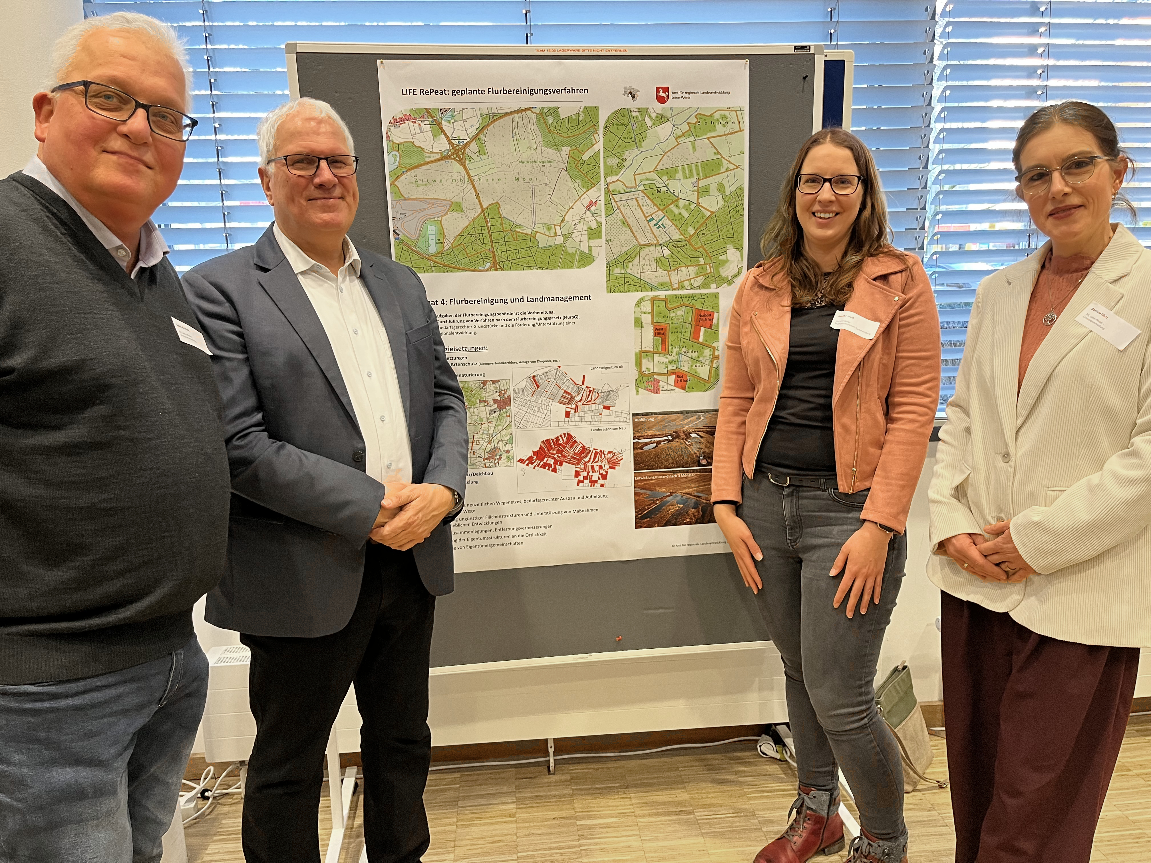 Ziel ist es, für möglichst viele Flächen Kauf-, Tausch- oder Gestattungsverträge abzuschließen, um anschließend möglichst große, zusammenhängende Gebiete renaturieren zu können. „Die Wiederherstellung der drei Moore im LIFE-Projekt "RePeat" stellt eine anspruchsvolle Aufgabe dar, die nur gemeinsam mit allen Beteiligten und bei ausreichender Flächenverfügbarkeit gelingen kann. Unser Amt hat dabei die Federführung für die Flurbereinigungsverfahren in diesen sensiblen Landschaften übernommen. Flurbereinigung heute bedeutet für uns, dass Transparenz, Beteiligung und Akzeptanz hierbei einen hohen Stellenwert erhalten. Mit dem LIFE-Projekt "RePeat" setzen wir uns gezielt dafür ein, den Moorschutz und die regionale Entwicklung in Einklang zu bringen – stets im engen Dialog mit den Menschen vor Ort“, erklärt Ottmar von Holtz, Landesbeauftragter für regionale Landesentwicklung Leine-Weser, bei der Auftaktveranstaltung am 14. Januar im Haus der Regionen.