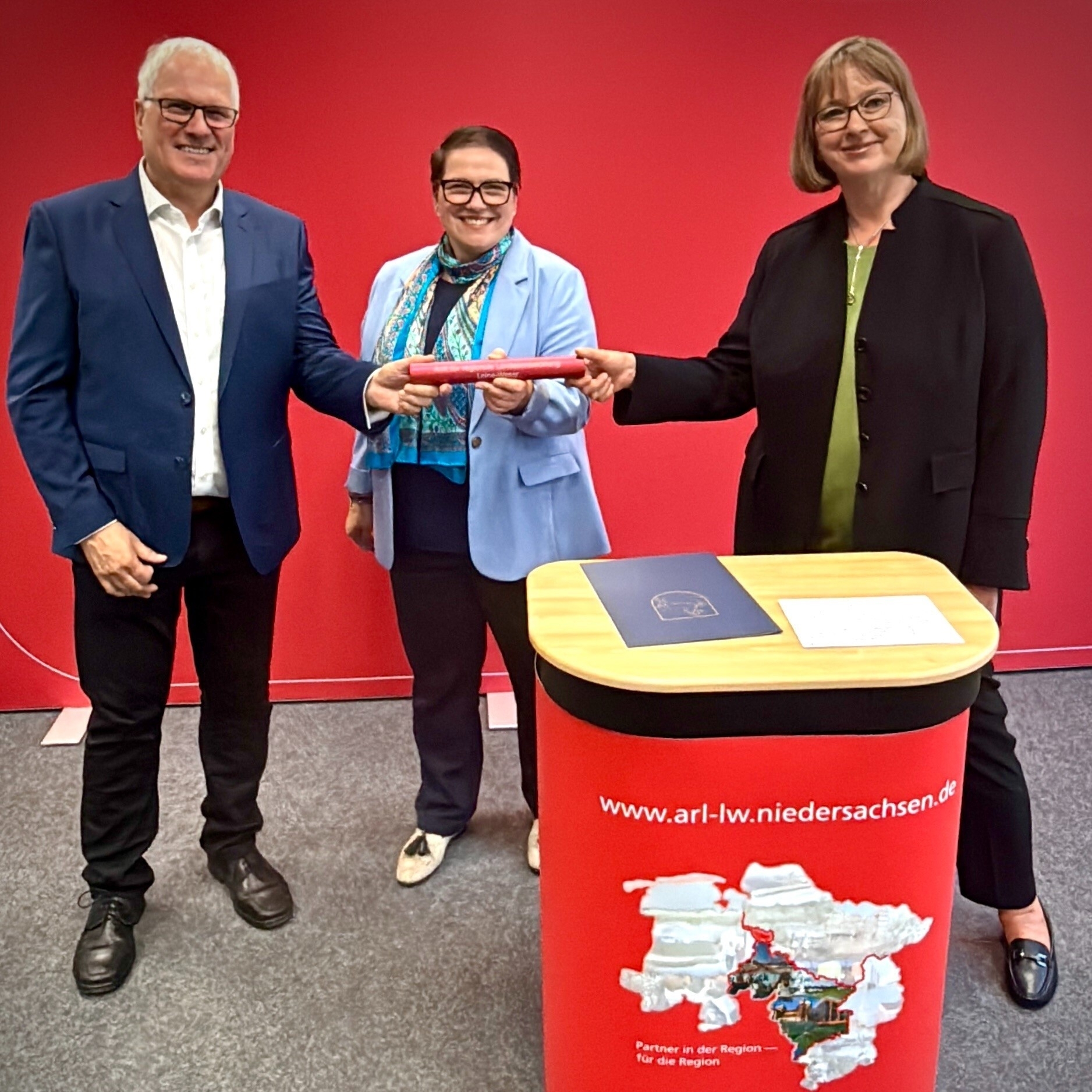 Mit einer symbolischen Staffelstabübergabe begrüßte Ministerin Walter anschließend Ottmar von Holtz als neuen Landesbeauftragten für regionale Landesentwicklung Leine-Weser: „Ich freue mich sehr, mit Ottmar von Holtz eine so vielschichtige und erfahrene Persönlichkeit für die wichtige Aufgabe des Landesbeauftragten gewonnen zu haben. Als ‘Anwalt der Region‘ wird er die erfolgreiche Arbeit fortsetzen und mit frischen Impulsen in die Zukunft führen.“