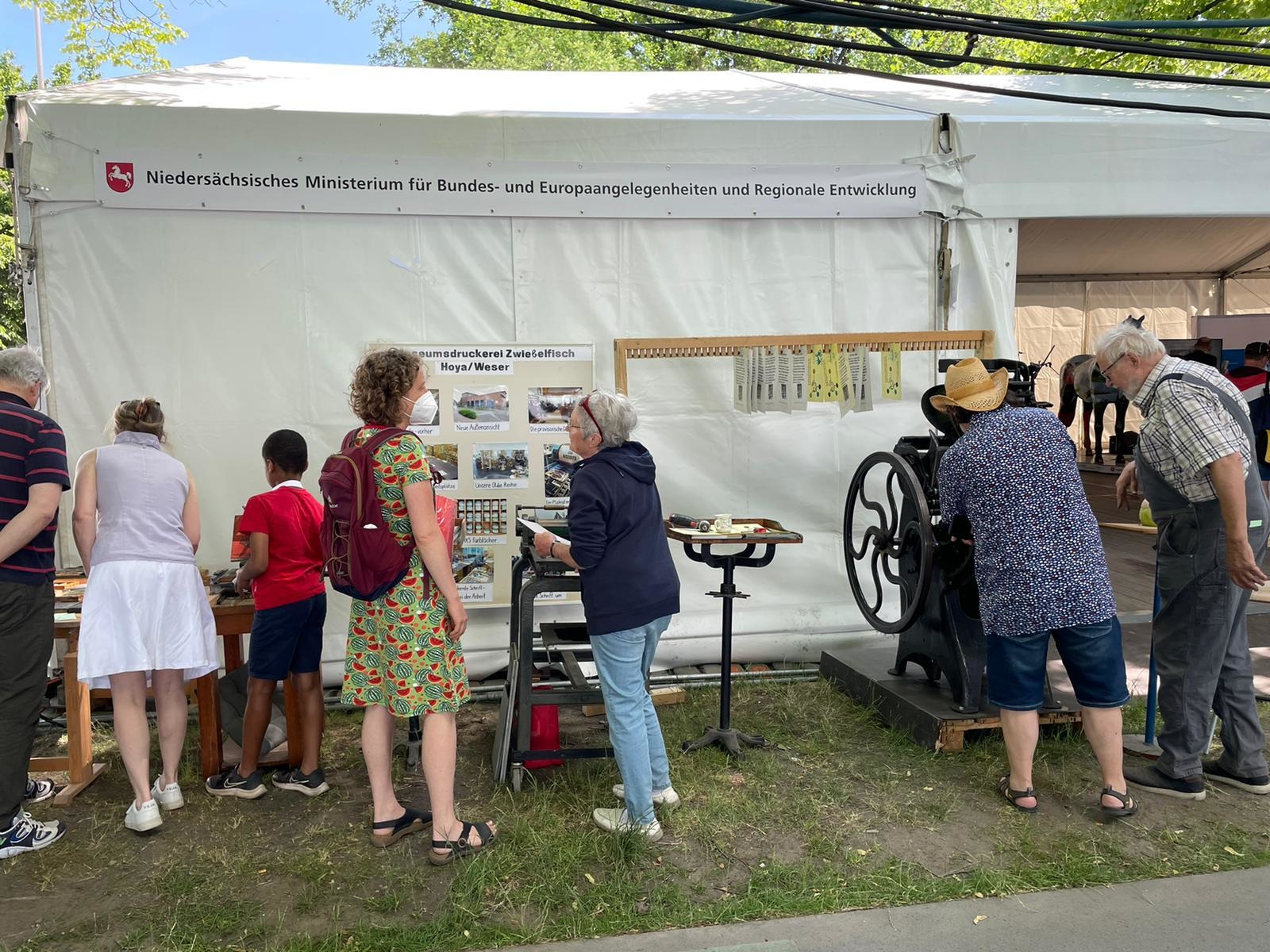 Auch das ArL Leine-Weser war dort in einem Stand vor Ort, gemeinsam mit dem Niedersächsischen Ministerium für Bundes- und Europaangelegenheiten und Regionale Entwicklung sowie den anderen Ämtern für regionale Landesentwicklung. Am Sonntag, den 12. Juni, erwarteten die Mitarbeiterinnen und Mitarbeiter der Standorte Sulingen und Hildesheim die Besucher mit einer alten Druckermaschine aus der Alten Molkerei in Hoya. Dort, in der Geburtsstätte der Kreiszeitung, entstand 2021 der außerschulische Lernort „Schwarze Kunst in Hoya“ als Teilprojekt des Gesamtvorhabens „Interaktiver Zukunftsraum Alte Molkerei“, der durch das Programm „Zukunftsräume in Niedersachsen“ gefördert worden war. Die Besucher des Standes konnten sich die Nutzung der Maschinen erklären lassen und dem Druck zuschauen, aber auch etwas über die Arbeit des Amtes und seine Projekte erfahren. Landesbeauftragte Dinah Stollwerck-Bauer nahm außerdem am Talk auf der Bühne teil.