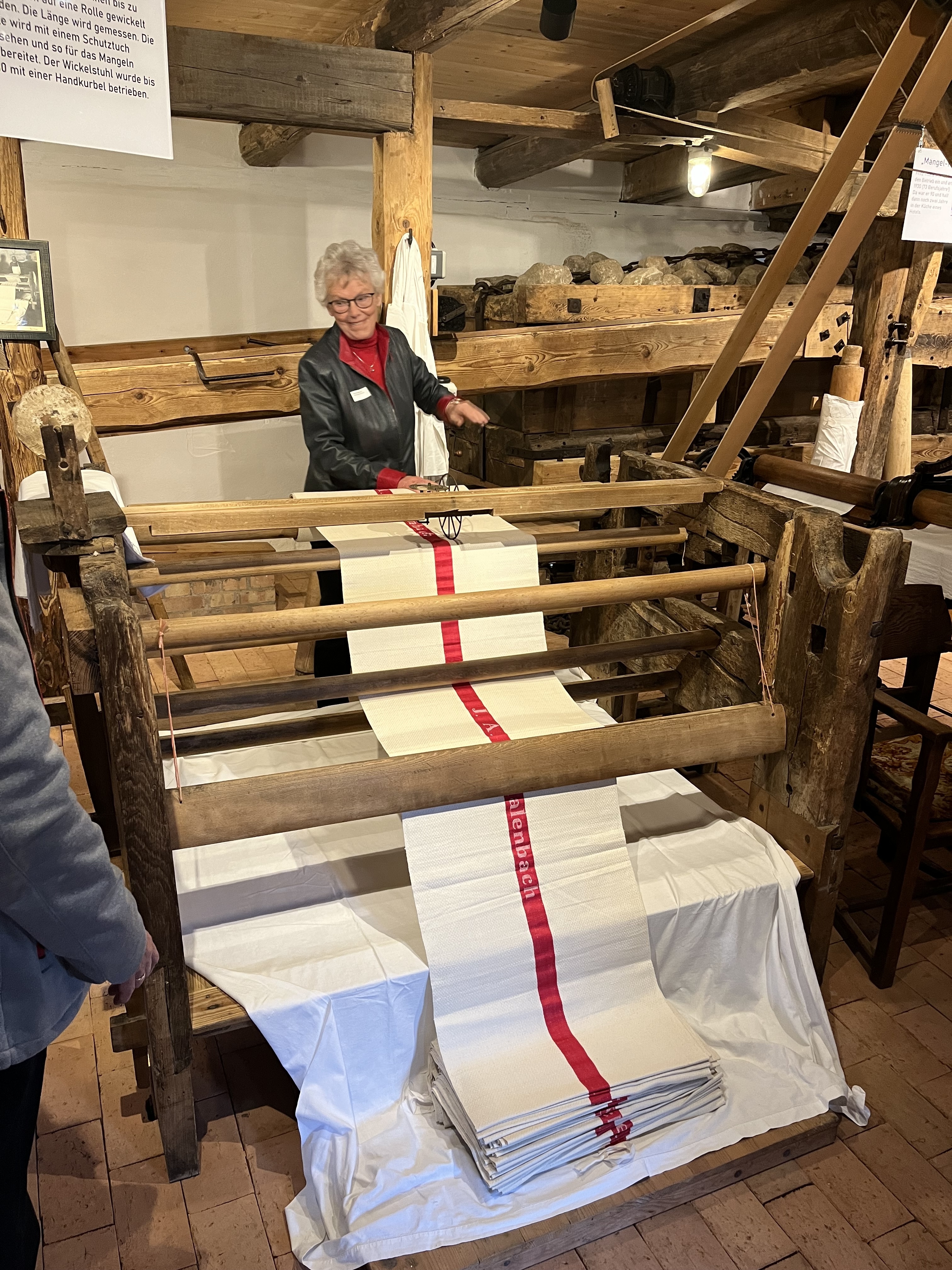 Die historische Kastenmangel ist noch immer voll funktionsfähig und glättet viele Meter Leinen.