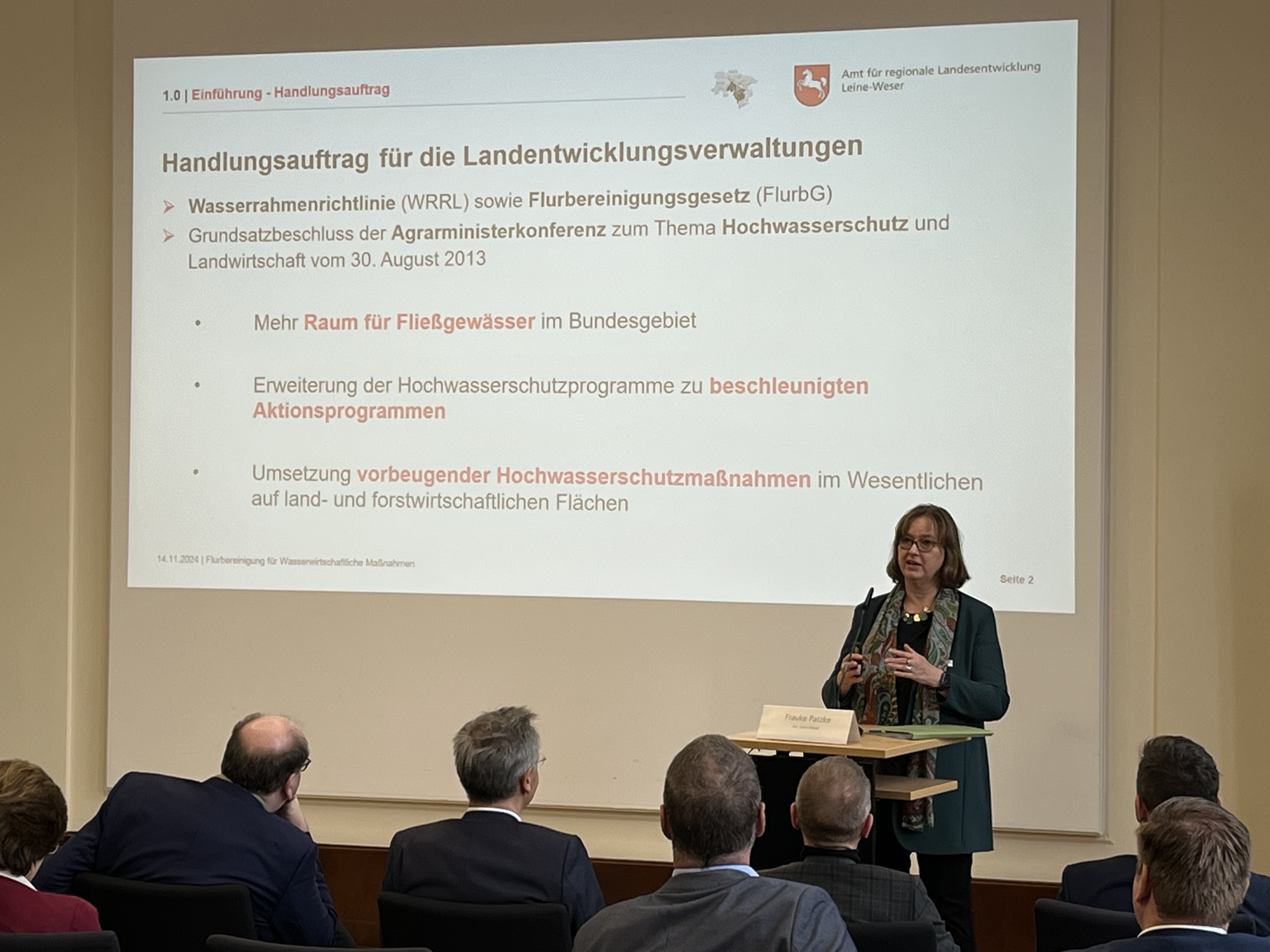 Frauke Patzke, Landesbeauftragte für regionale Landesentwicklung Leine-Weser, sprach auf dem Gipfel über Möglichkeiten des Hochwasserschutzes im Bereich der Flurbereinigung: „Durch gute und frühzeitige Abstimmung aller Beteiligten im Verfahrensverlauf und zielgerichtete Landbereitstellung, besteht nahezu in jeder Flurbereinigung die Möglichkeit, Hochwasserschutz- und Gewässerentwicklungsmaßnahmen mit umzusetzen. Kürzlich erst konnte beispielsweise das Flurbereinigungsverfahren in Heersum abgeschlossen werden, in dem der Hochwasserschutz mittels Deichbau eine große Bedeutung hatte.“