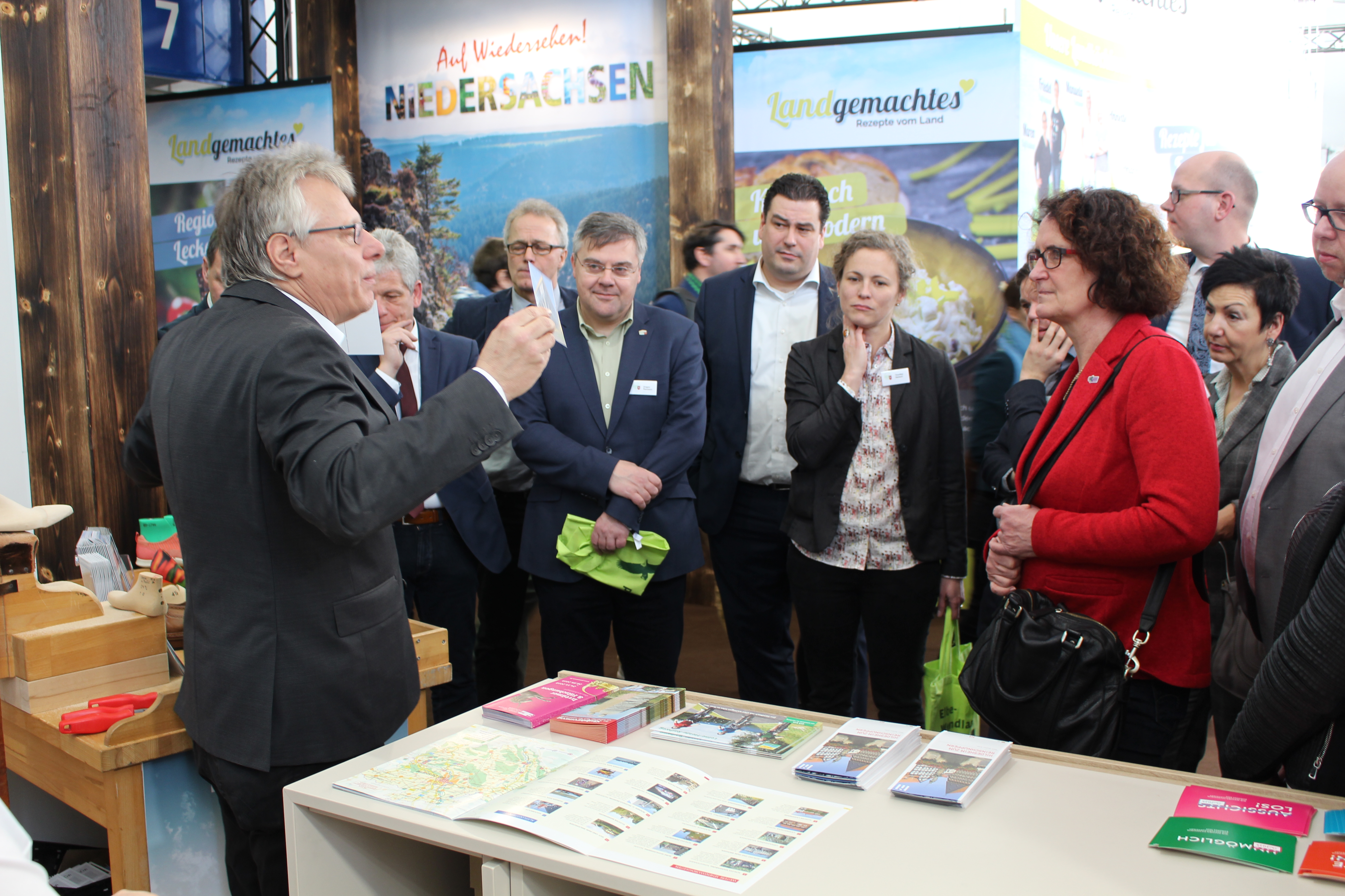 Hans-Herbert Miehe vom Fagus-Werk Alfeld informiert den Nds. Ausschuss für Ernährung, Landwirtschaft und Verbraucherschutz am benachbarten Stand des Landkreises Hildesheim