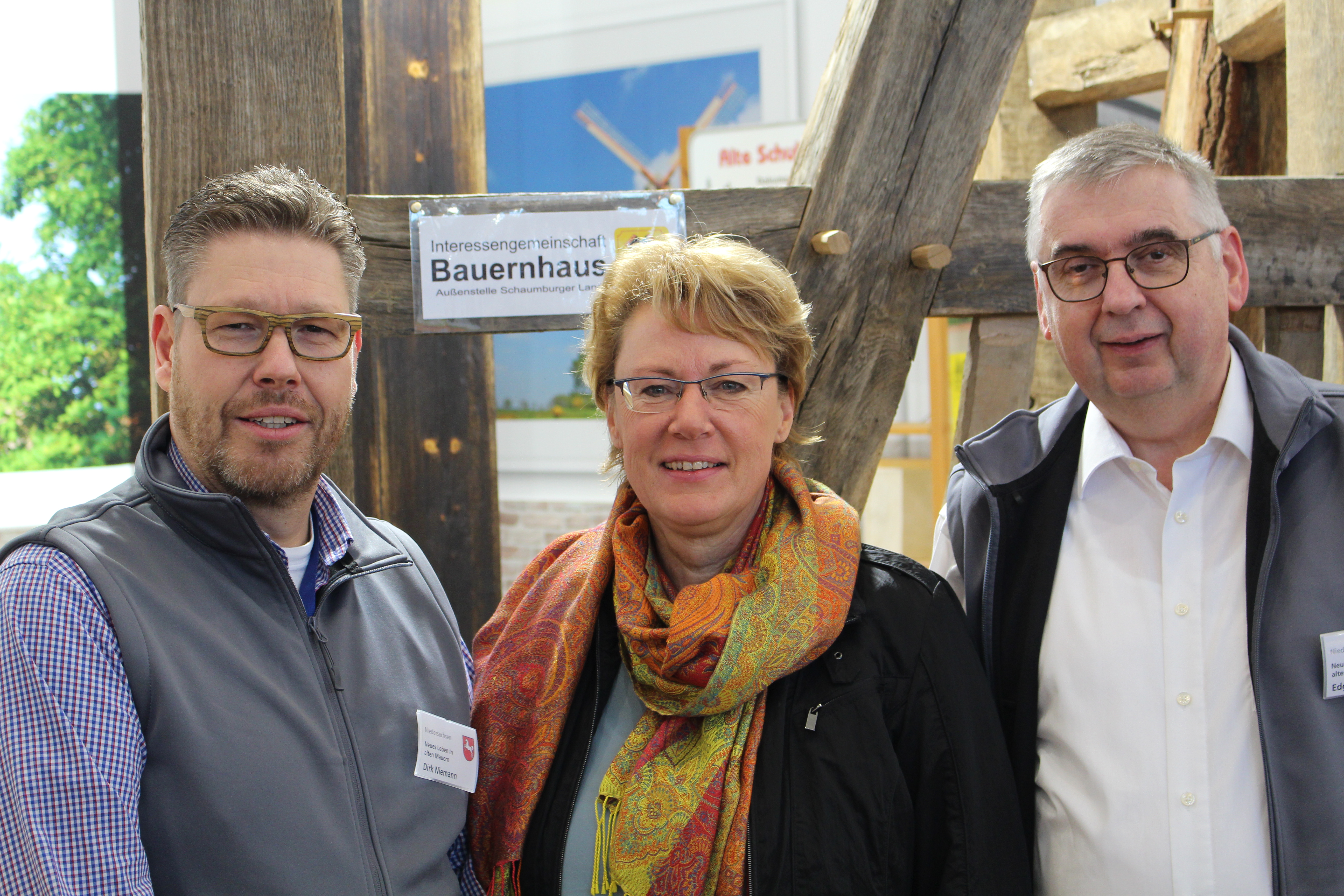 Auf ihrem Rundgang informiert sich die Nds. Ministerin für Ernährung, Landwirtschaft und Verbraucherschutz Barbara Otte-Kinast über das Leader-Kooperationsprojekt "Baukulturdienst" (Dr. Volker Wehmeyer (l.), Manfred Röver (r.), IgB)