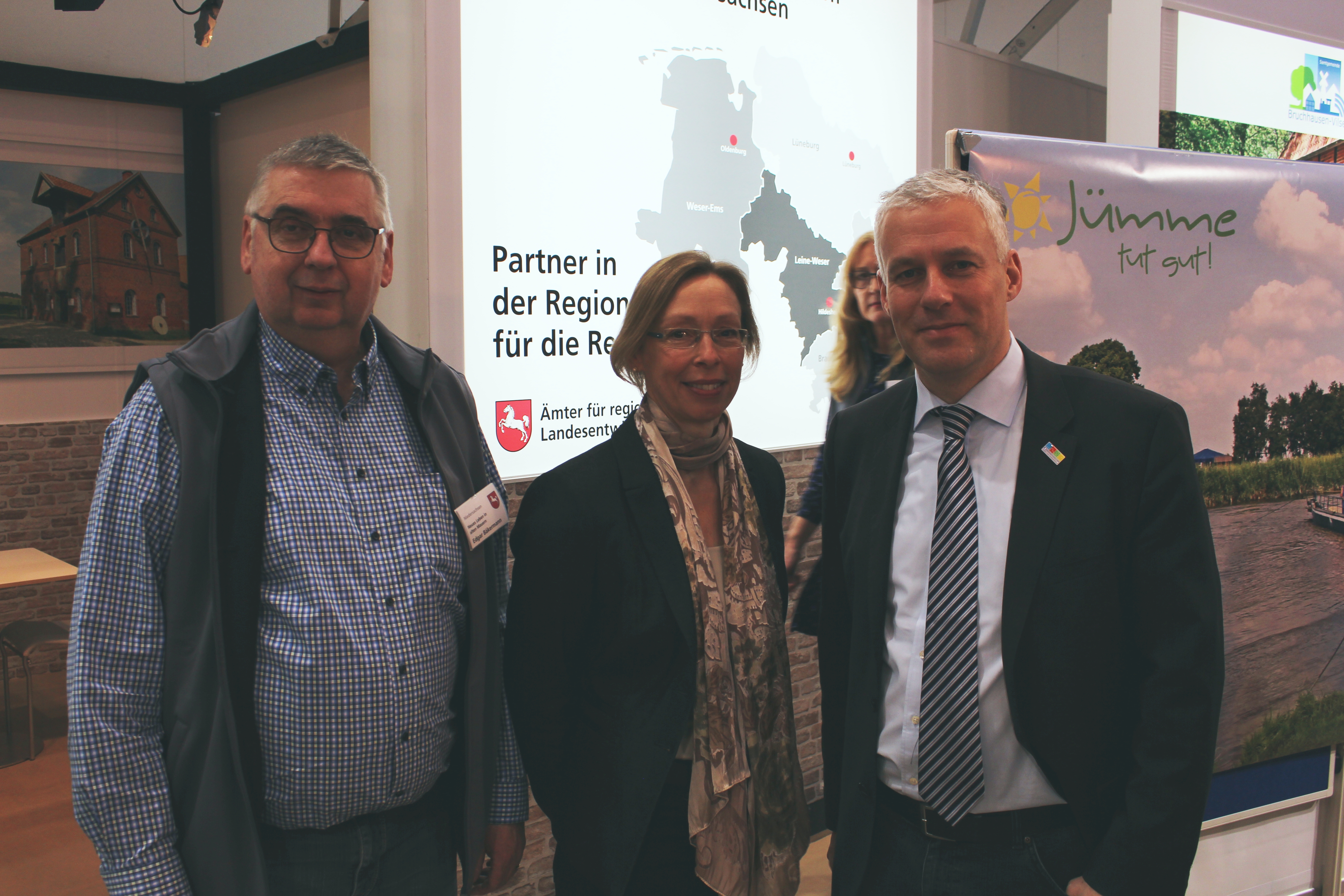 Reger Austausch auf dem Stand des Niedersächsischen Ministeriums für Ernährung, Landwirtschaft und Verbraucherschutz (v.l.n.r.: Edgar Bäkermann [ArL L-W], Heike Fliess [Landesbeauftragte ArL L-W], und Dr. Marco Trips [Präsident des NSGB])