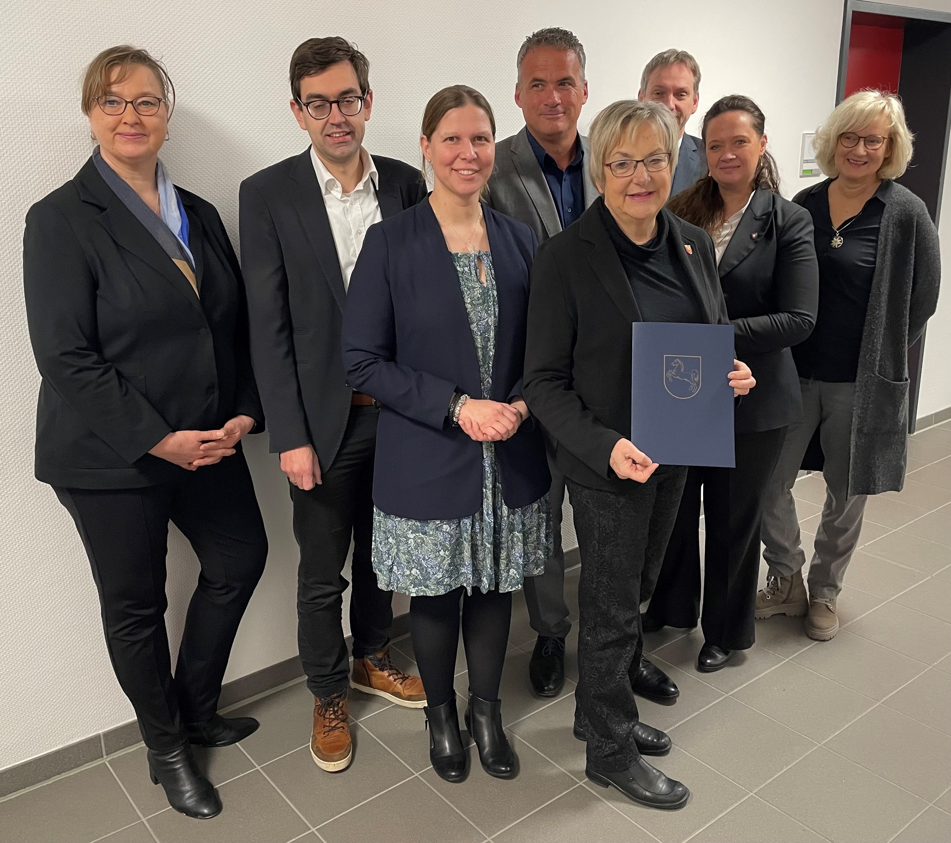 Stadthagen bekommt bereits zum dritten Mal eine Förderung aus dem Programm Zukunftsräume – diesmal in Höhe von 63.164 Euro für eine Personalstelle für Community-Management, mit deren Expertise und Tatkraft der Bürgerdialog weiterentwickelt werden soll. Bürgermeister Oliver Theiß nahm den Bescheid für dieses Projekt von Ministerin Osigus entgegen. Das Herzstück der Stadthäger Strategie bildet das Internetportal „Stadt.Punkt“, wo Bürgerinnen und Bürger alltagsrelevante Informationen finden – von Behördenterminen über Straßenbaumaßnahmen bis hin zu langfristigen Planungsvorhaben. Gleichzeitig können sie über das Portal mit Verwaltung und Stadtpolitik in Austausch treten. Mit einer Bewilligung in der ersten Antragsrunde des Programms „Zukunftsräume Niedersachsen“ im Jahr 2020 hat die Stadt Stadthagen das Living Care Lab in der Innenstadt erfolgreich etabliert. Dies ist seither ein wichtiger Erfolgsfaktor in der Stadtentwicklung und wird nun mit weiterer Unterstützung aus dem Programm in dem Projekt „Transformation zur vorsorgenden, gesunden Stadt“ durch viele weitere Maßnahmen fortgeführt.
