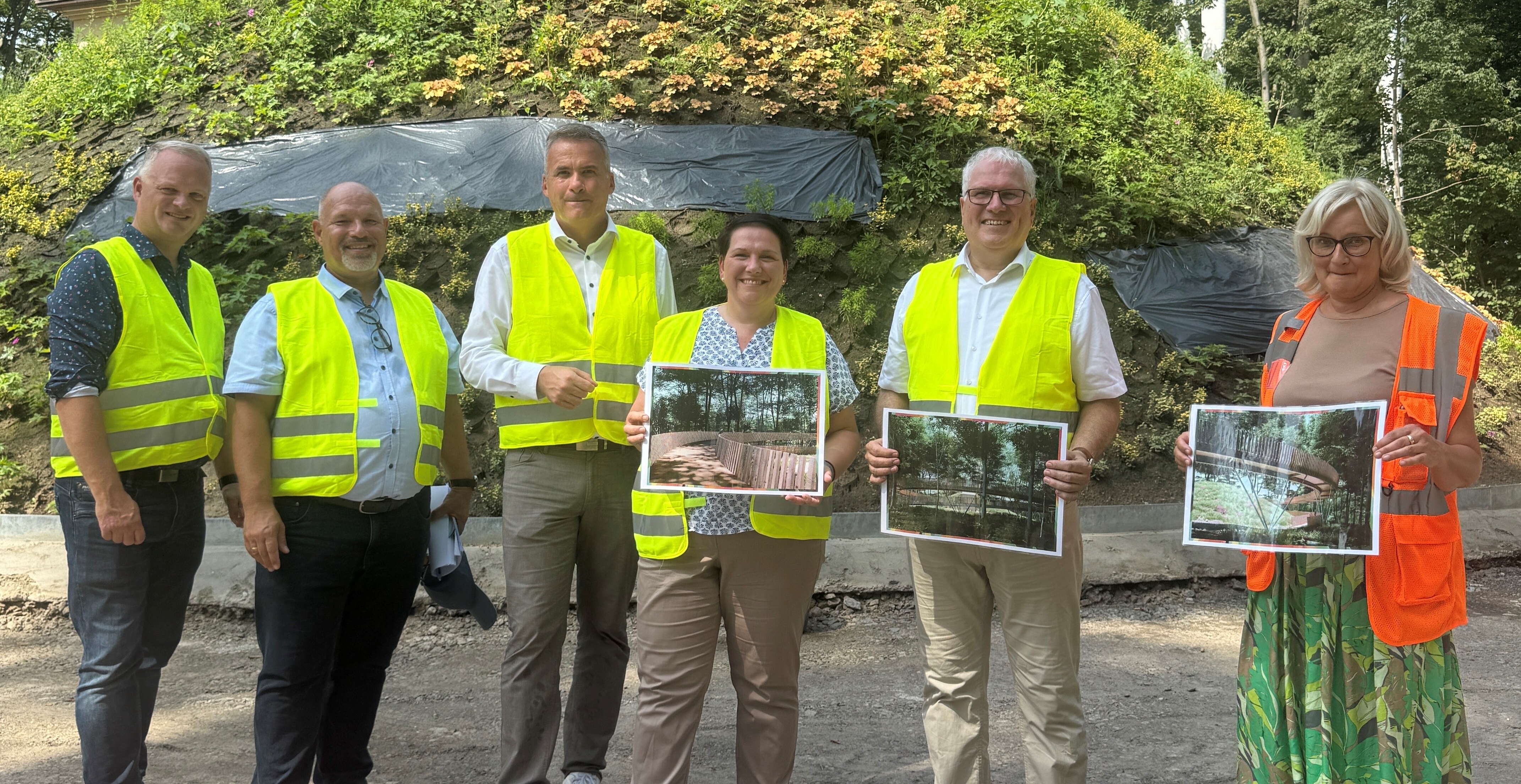 Erster Halt war die Kurstadt Bad Nenndorf, die sich mit großen Schritten auf die Landesgartenschau 2026 vorbereitet. Ministerin Walter und Landesbeauftragter von Holtz machten gemeinsam mit Samtgemeindebürgermeister Mike Schmidt, den beiden Geschäftsführern der Landesgartenschau, Benjamin Lotz und Annette Stang, sowie weiteren Mitarbeitenden aus dem Projektteam einen Rundgang durch die künftigen Gartenschauflächen: eine Liegewiese mit Teichanlage, eine offene Liegehalle mit moderner Holzarchitektur und ein atmosphärischer „Waldtempel“, der Naturerlebnis und Kulturveranstaltungen verbinden wird. Die Maßnahmen werden durch verschiedene Förderprogramme unterstützt und zeigen, wie Landesmittel und Städtebauförderung lokale Visionen realisieren helfen.