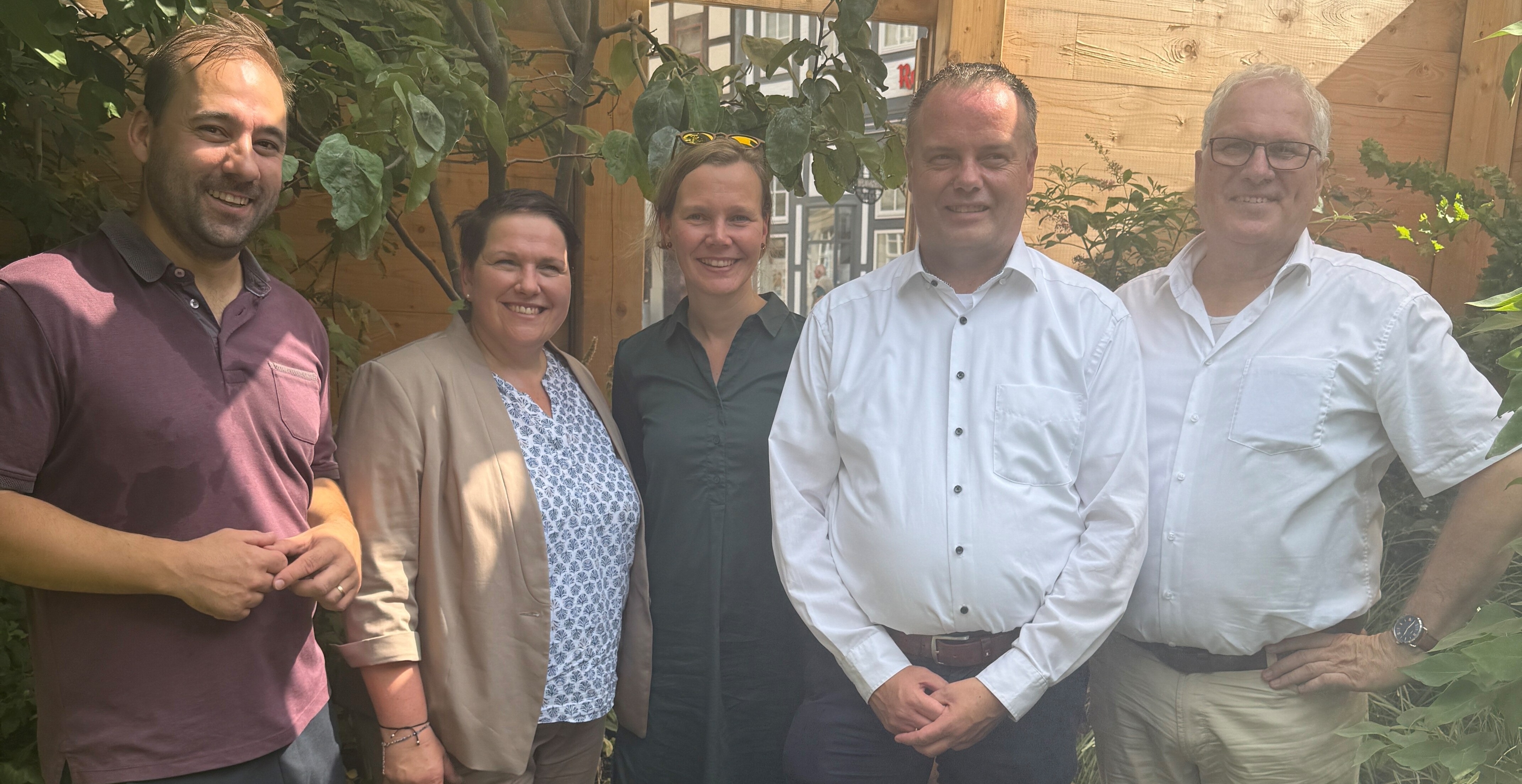 Danach ging es weiter nach Hameln, wo es sich um zentrale Zukunftsthemen drehte: Stadtentwicklung mit Klimaaspekt und digitale Transformation mit Fachkräftesicherung. Zunächst sorgte die begehbare KlimaKiste vor dem Hochzeitshaus bei allen Beteiligten für eine willkommene Abkühlung bei den sommerlichen Temperaturen. Sie erzeugt eine Abkühlung durch Pflanzen, Wasser und Schatten - ein innovatives, bereits ausgezeichnetes, Projekt zur Hitzeresilienz in Innenstädten aus der Richtlinie „Zukunftsräume“, das über klimagerechte Stadtgestaltung aufklärt und Ideen aus der Bürgerschaft aufgreift. In diesem Sommer ist die KlimaKiste außerdem Teil der Aktion „Hameln. Komm, wie Du bist.“ mit weiteren Highlights wie Pop-Up-Spielplätzen, bunten Sitzgelegenheiten oder gelben Tischtennisplatten. Diese sahen sich Ministerin Walter und Landesbeauftragter von Holtz bei einem gemeinsamen Rundgang durch die Innenstadt mit Oberbürgermeister Claudio Griese, der Ersten Stadträtin Martina Harms und Dennis Andres, Geschäftsführer Stadtmarketing an. Begleitet wurden sie dabei von Barbara Otte-Kinast, Vizepräsidentin des Niedersächsischen Landtags, Johannes Schraps, Bundestagsabgeordneter (SPD) und Britta Kellermann, Landtagsabgeordnete (Bündnis 90/Die Grünen).