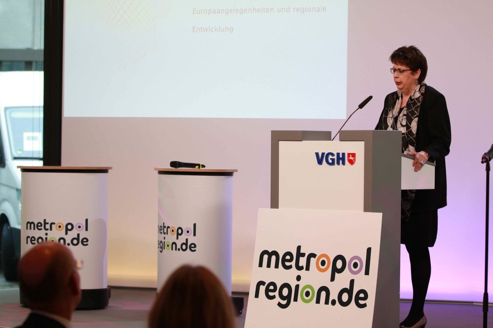 Neben einer Ansprache von Birgit Honé, Ministerin für Bundes- und Europaangelegenheiten und regionale Entwicklung, gab unter anderem der Vorsitzende des Aufsichtsrates der Metropolregion GmbH, Oberbürgermeister Ulrich Markurth, einen Überblick über die zehnjährige Kooperation in der Metropolregion, nicht ganz einfache Startbedingungen und viele verschiedene Interessenlagen, die bis heute eine großräumige Kooperation immer wieder herausfordernd machen.