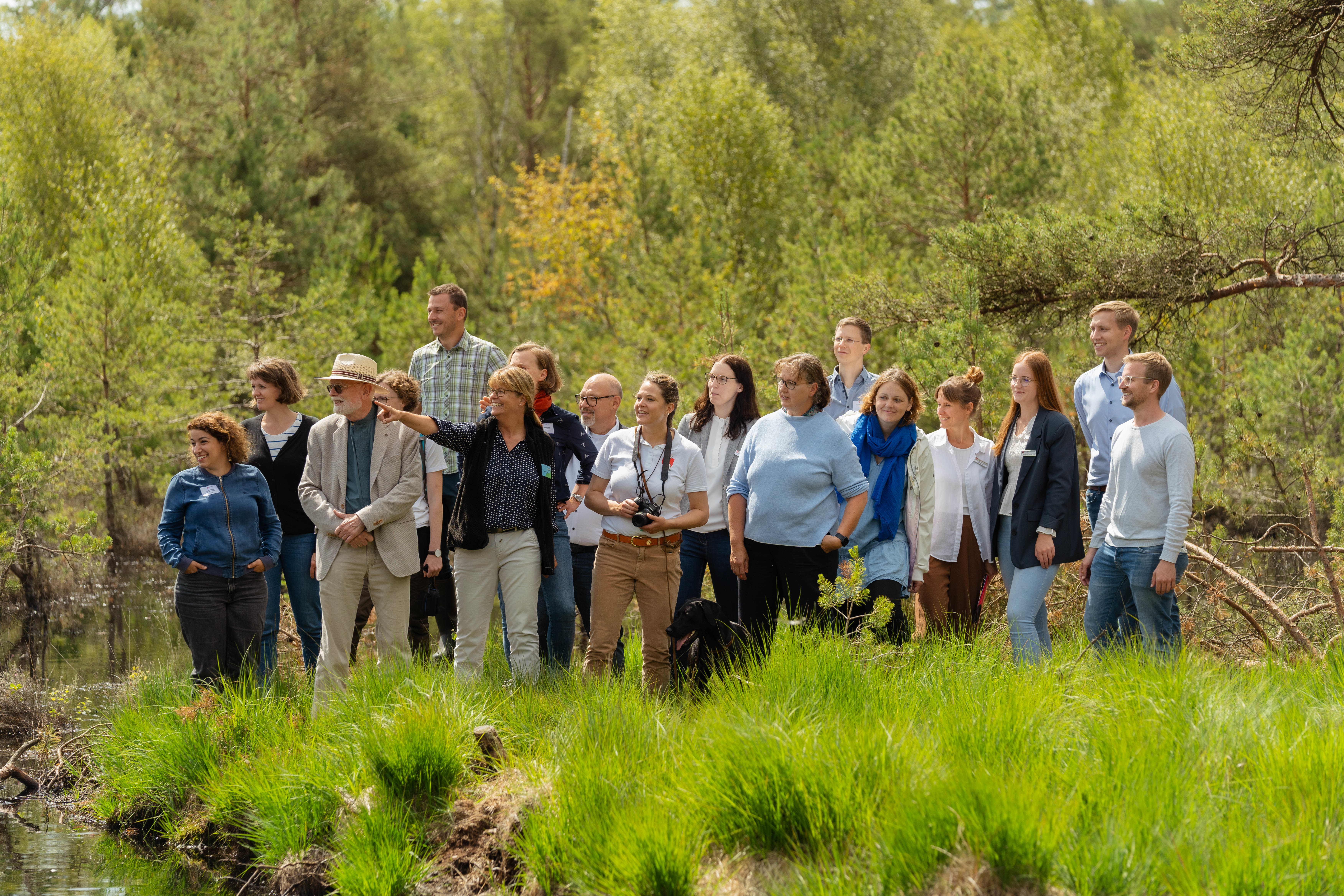 Landesbeauftragte Frauke Patzke (Mitte) im Gespräch mit Jennifer Weiß und Aaron Steins zu Details des Flurbereinigungsverfahrens Hannoversche Moorgeest im Otternhagener Moor.