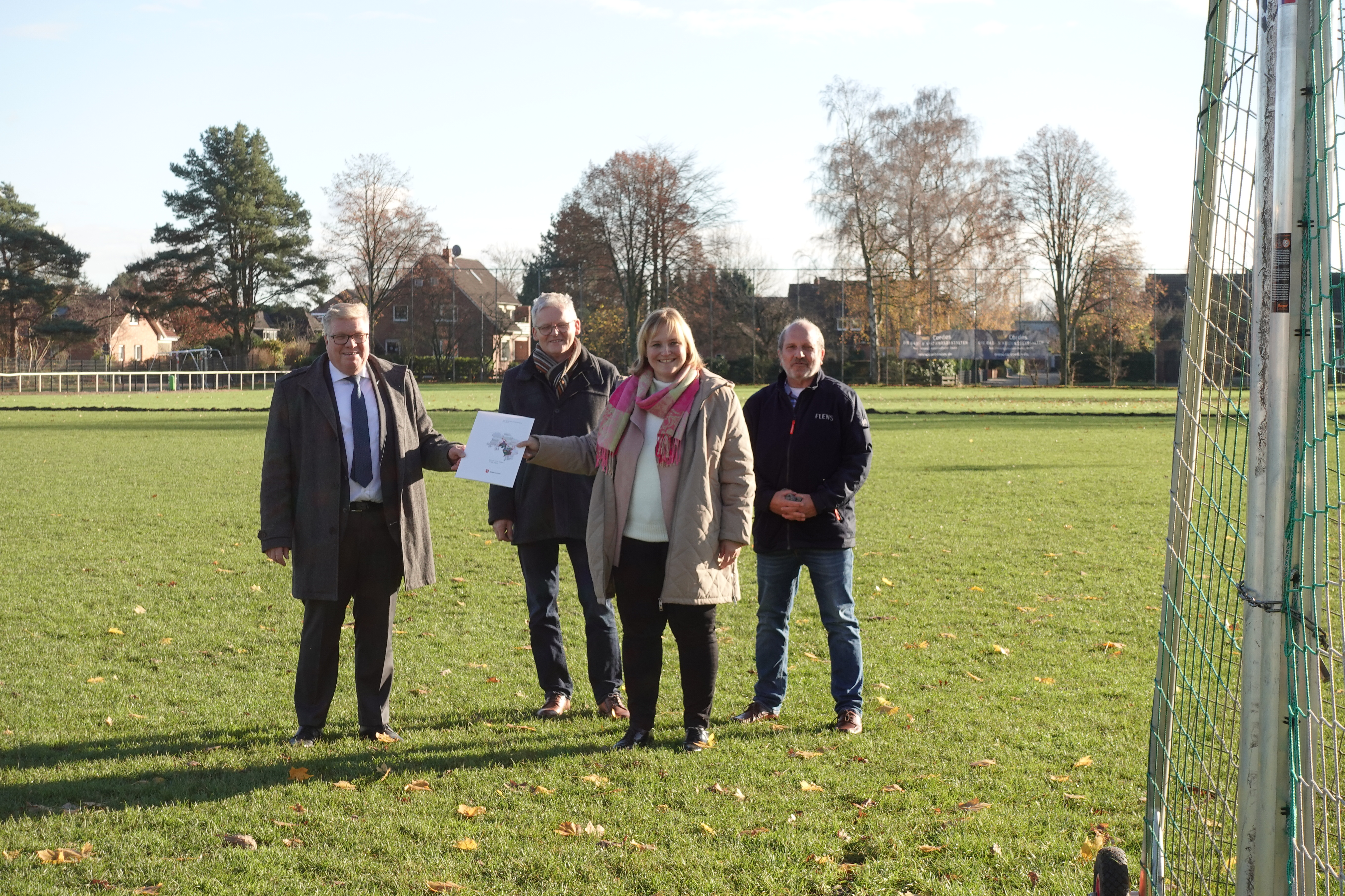 HILDESHEIM/BASSUM. – Attraktives Fußballspielen über das ganze Jahr hinweg wird nun in Bassum möglich. Mit 200.000 Euro unterstützt der „Investitionspakt zur Förderung von Sportstätten“ die Fördermaßnahme zur „Herstellung der Wintertauglichkeit eines Naturrasenplatzes“. Einen entsprechenden Förderbescheid überreichte am heutigen Montag, 22. November 2021, Dinah Stollwerck-Bauer, Landesbeauftragte für regionale Landesentwicklung Leine-Weser, an Bürgermeister Christian Porsch.
