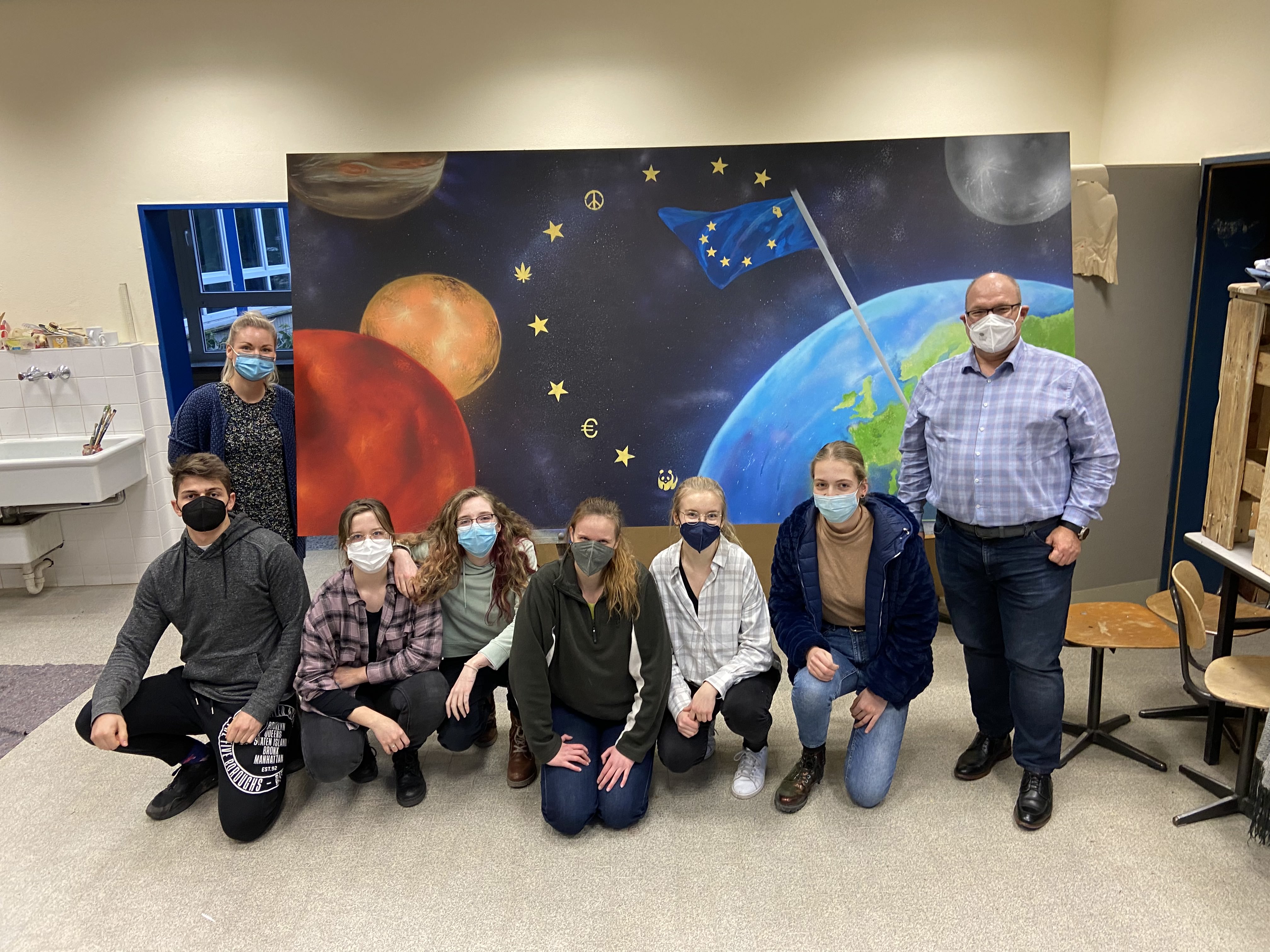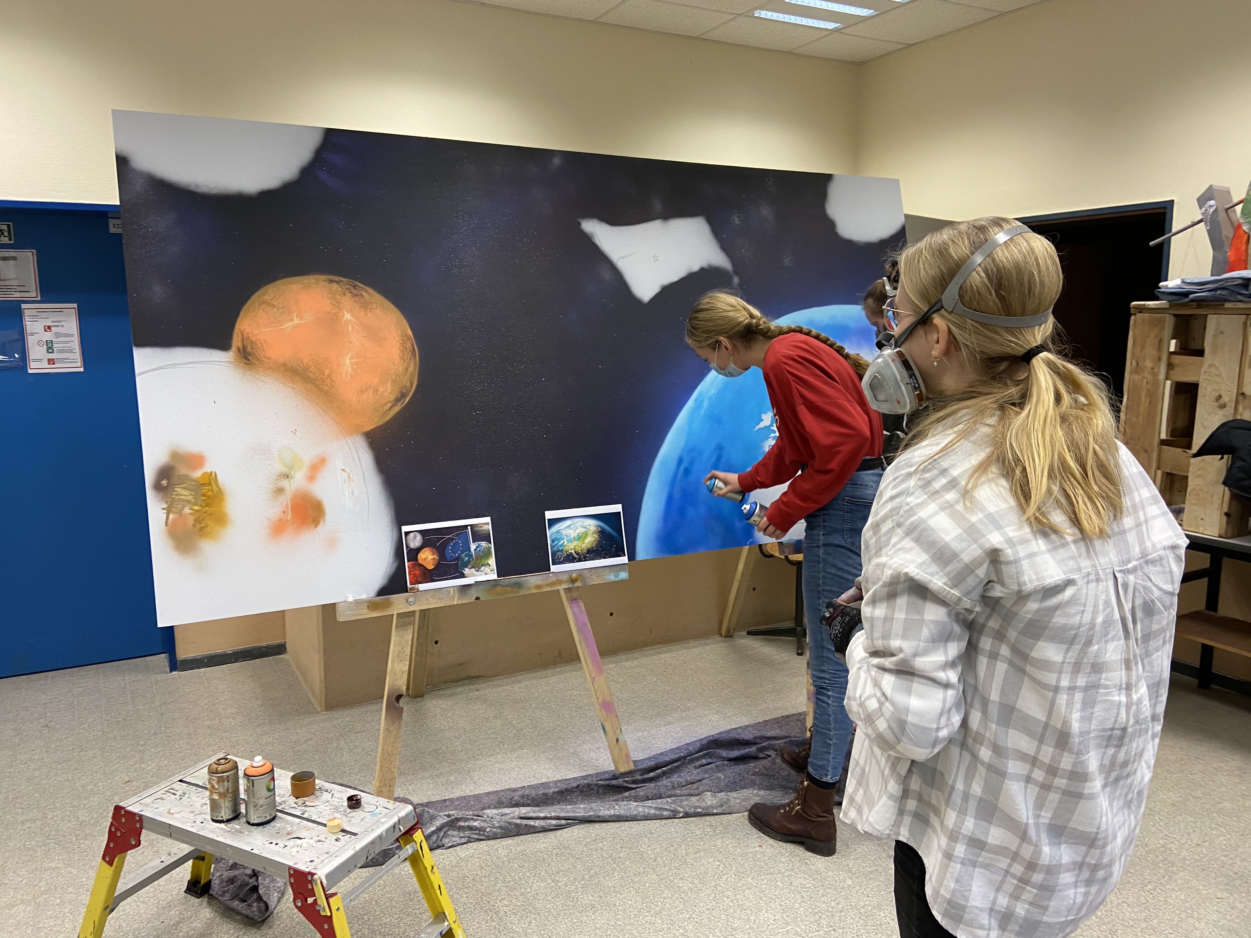 Organisiert hat das Angebot das Europabüro des Amtes für regionale Landesentwicklung Leine-Weser, um den Schülerinnen und Schüler die Zukunftsthemen Europas wie Digitaler Wandel, Bildung, Klimawandel, Kultur und Sport, aber auch Sicherheit, Migration und Gesundheit praktisch näher zu bringen. Nach einer ersten technischen Einführung im Umgang mit der Sprühdose, wurden zunächst Ideen zur Umsetzung des Themas auf die Sprühplatte gesammelt. Am zweiten Workshop-Tag begannen die Teilnehmerinnen und Teilnehmer ihre Ideen visuell zu formulieren und erste Skizzen entstanden. Am Nachtmittag wurde dann zum ersten Mal mit den Sprühdosen an der Umsetzung gearbeitet. Am dritten und letzten Workshop-Tag entstanden die eigentlichen Kunstwerke.