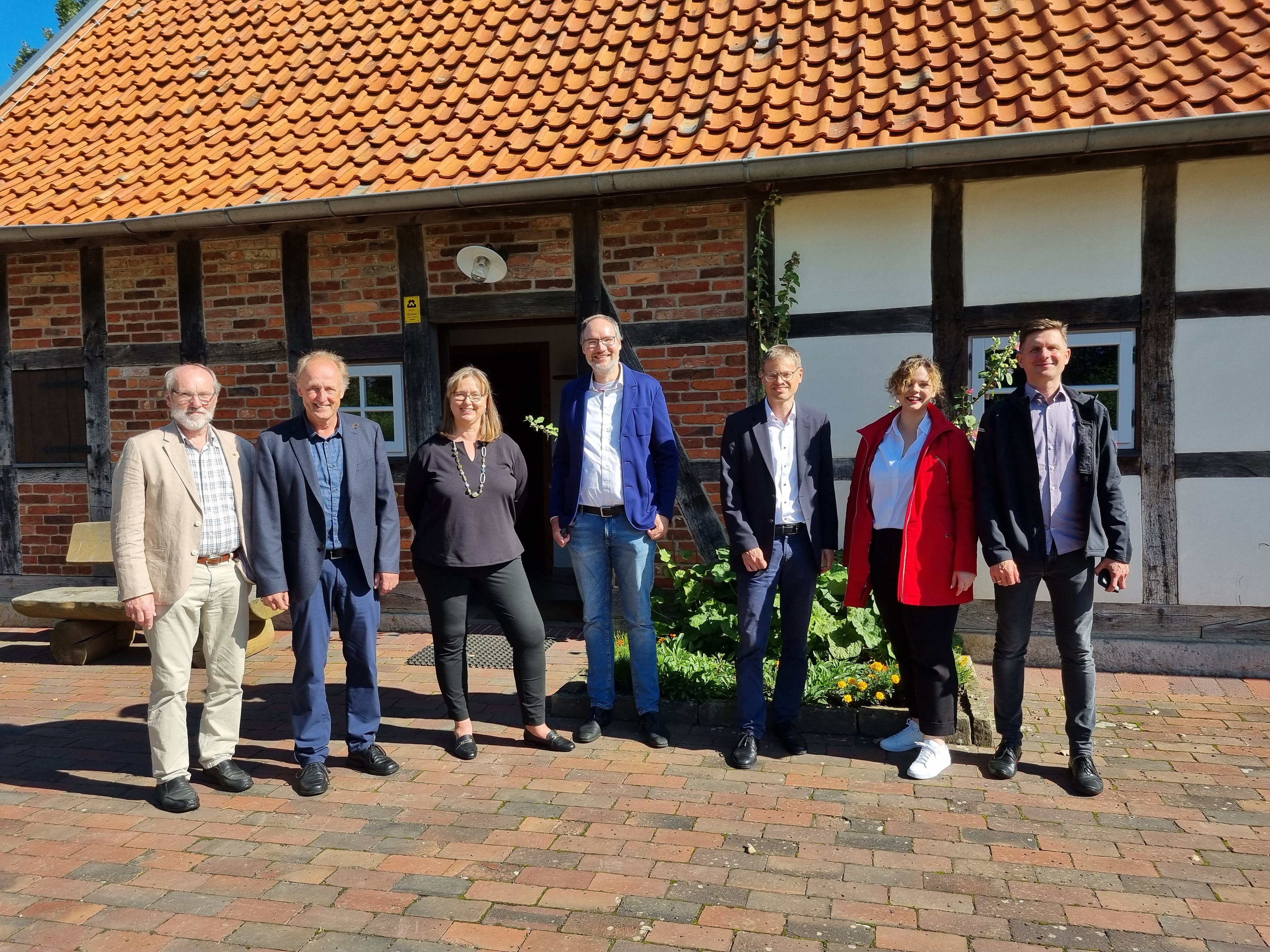 Bei der Bescheidübergabe in Lauenhagen (v. links): Manfred Röver (Architekt), Siegbert Krickhahn (Bürgermeister Lauenhagen), Frauke Patzke (Landesbeauftragte ArL Leine-Weser), Christopher Jauca (ArL Leine-Weser), Dr. Ludwig Schätzl (Wirtschaftsförderung Schaumburg), Anna Rizou und Sebastian Tränkner (beide Niedersächsische Landgesellschaft).