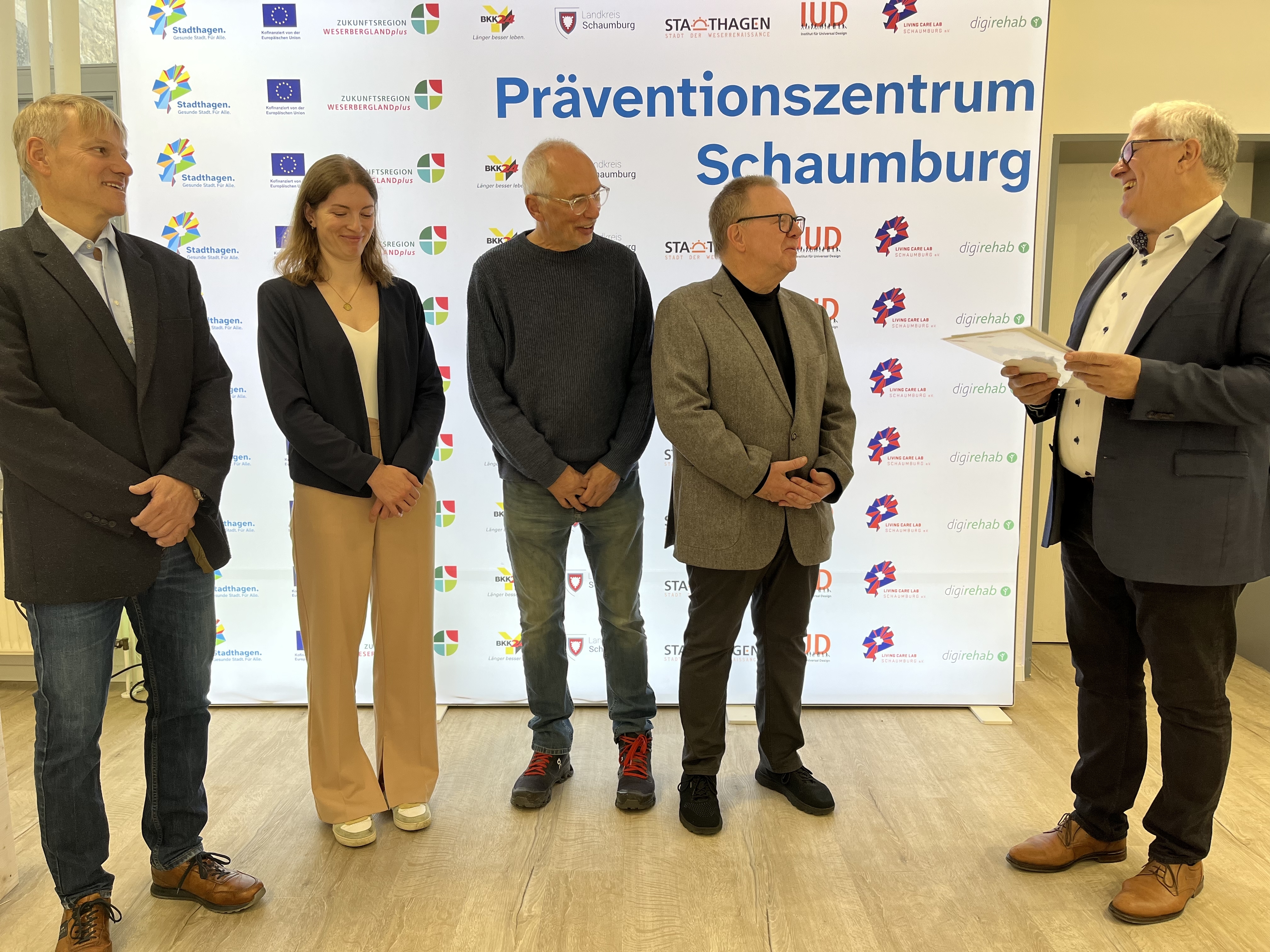 Mit einem Besuch im Präventionszentrum der „Gesunde Stadt. Für Alle. gGmbH“ in Stadthagen startete der Tag. In Begleitung von Bürgermeister Oliver Theiß bekam Ottmar von Holtz zunächst einen Einblick in das Projekt von Leiter Thomas Bade. Im Anschluss überreichte der Landesbeauftragte einen Förderbescheid über 240.000 Euro. Die Mittel stammen aus dem Programm „Zukunftsregion Weserbergland+“, das an diesem Tag von Julia Kowitzke vertreten wurde, und werden durch zusätzliche Förderungen des Landkreises Schaumburg, der Stadt Stadthagen sowie des Vereins Living Care Lab Schaumburg ergänzt.