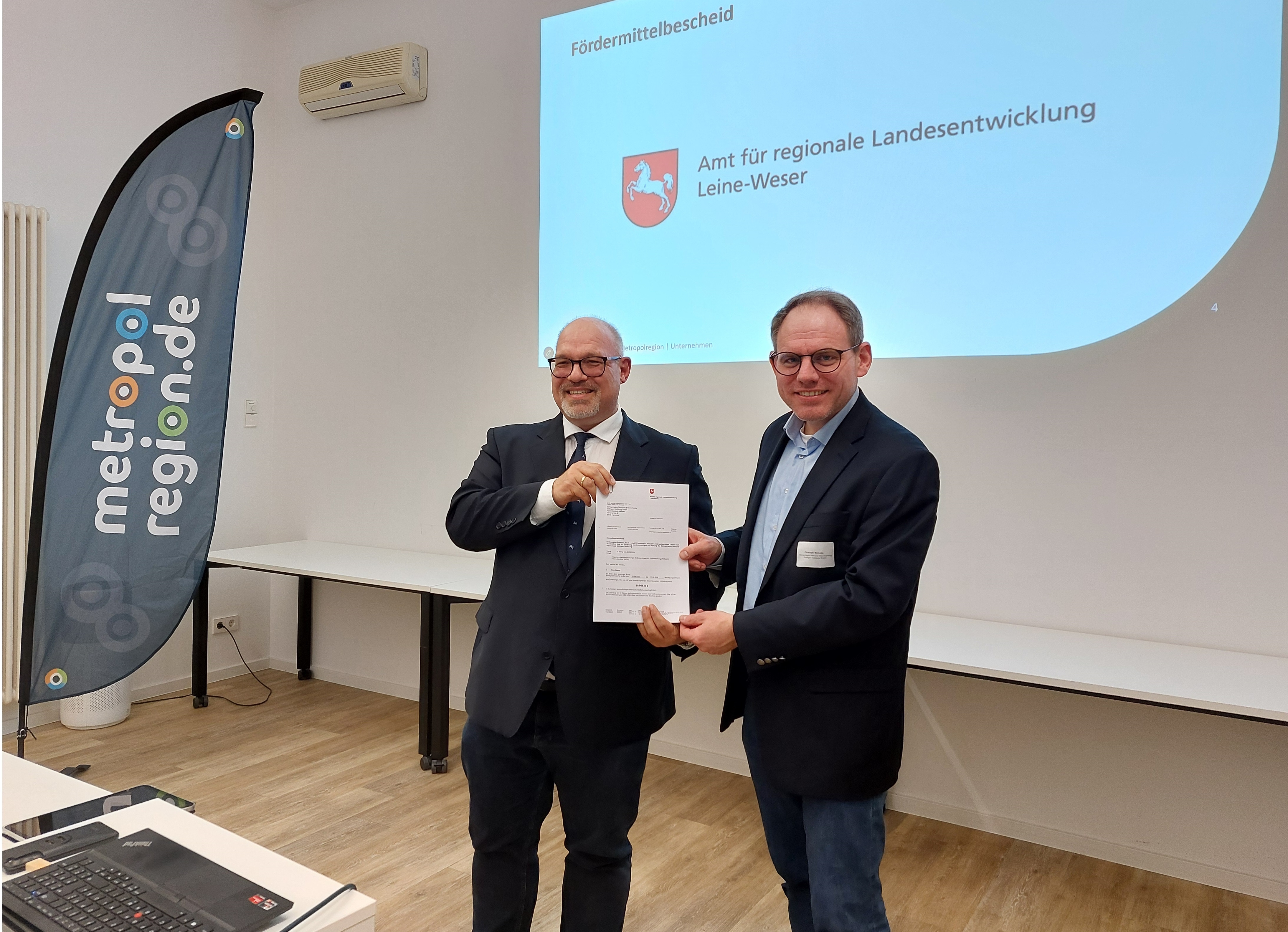 HANNOVER. Zum Vorreiter der KI-Entwicklung in Deutschland möchte die Metropolregion Hannover-Braunschweig-Göttingen-Wolfsburg GmbH werden. Einen wichtigen Schritt auf diesem Weg markierte der Auftakt des Projekts „Re:KI – Legal KI-Sandbox für Innovation und regulatorisches Lernen“ am Montag, 2. März 2026, mit der Förderbescheidübergabe im Haus der Wirtschaftsförderung in Hannover. Das Projekt wird mit rund 60.000 Euro unterstützt. Den Bescheid überreichte Dr. Frank Heidrich, stellvertretender Landesbeauftragter für regionale Landesentwicklung Leine-Weser, an Christoph Meineke, Geschäftsführer der Metropolregion GmbH. Damit wurde der Grundstein für eine der ersten regionalen Praxisplattformen zur Umsetzung des EU AI-Acts – das weltweit erste Gesetz, das klare Regeln für den Einsatz künstlicher Intelligenz vorgibt – in Deutschland gelegt.