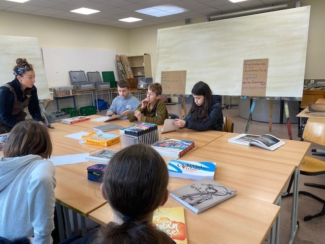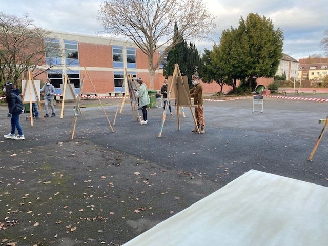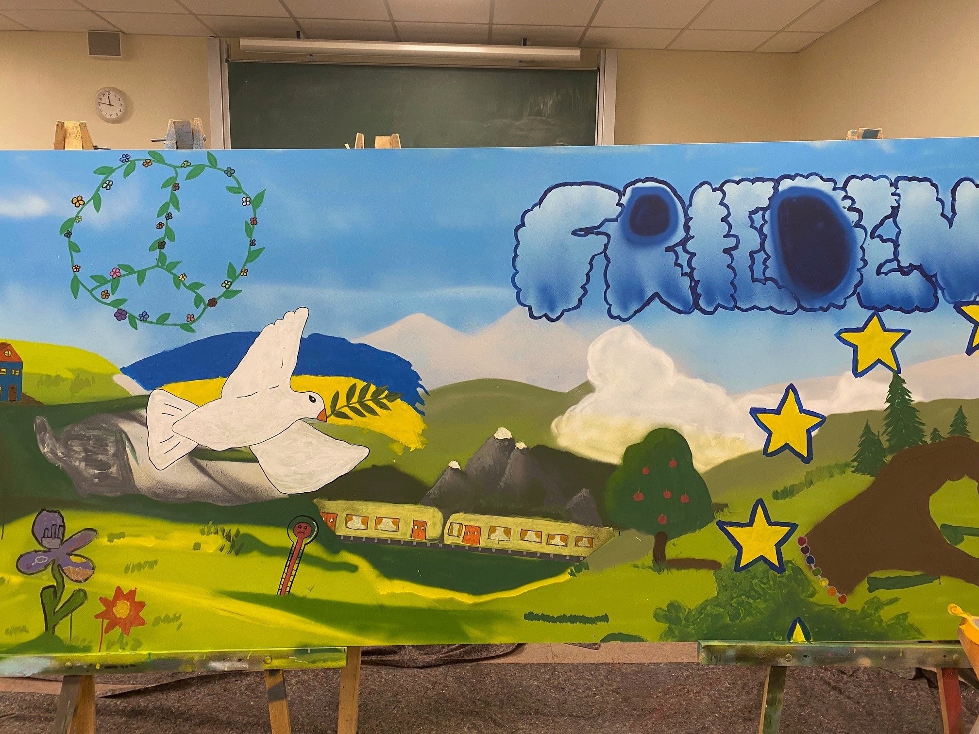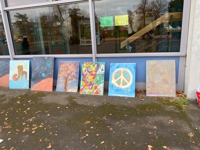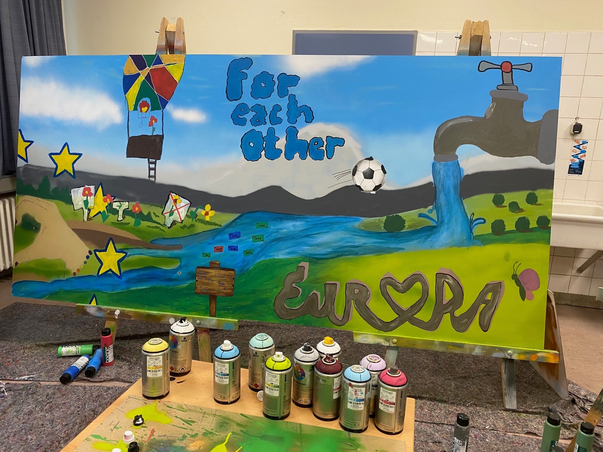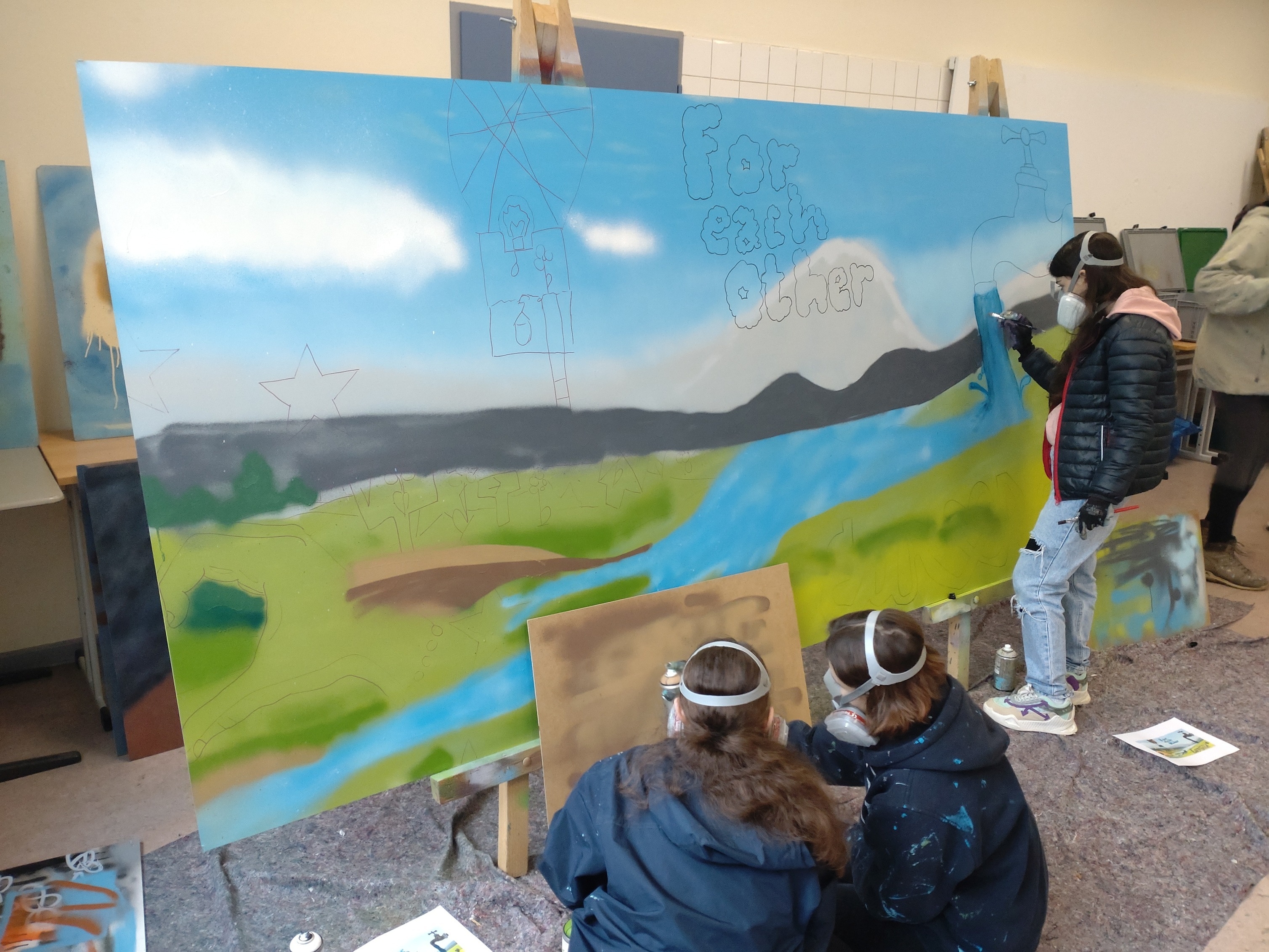 Ende November, Anfang Dezember 2022 entwickelten Kunstschülerinnen und -schüler der Realschule Himmelsthür unter der Anleitung der Graffiti-Künstler Phillip von Zitzewitz und Melina Grasso aus Pattensen eine großflächige Arbeit zum Themenbereich „Europa“.