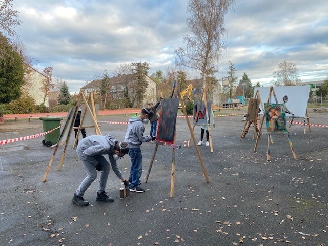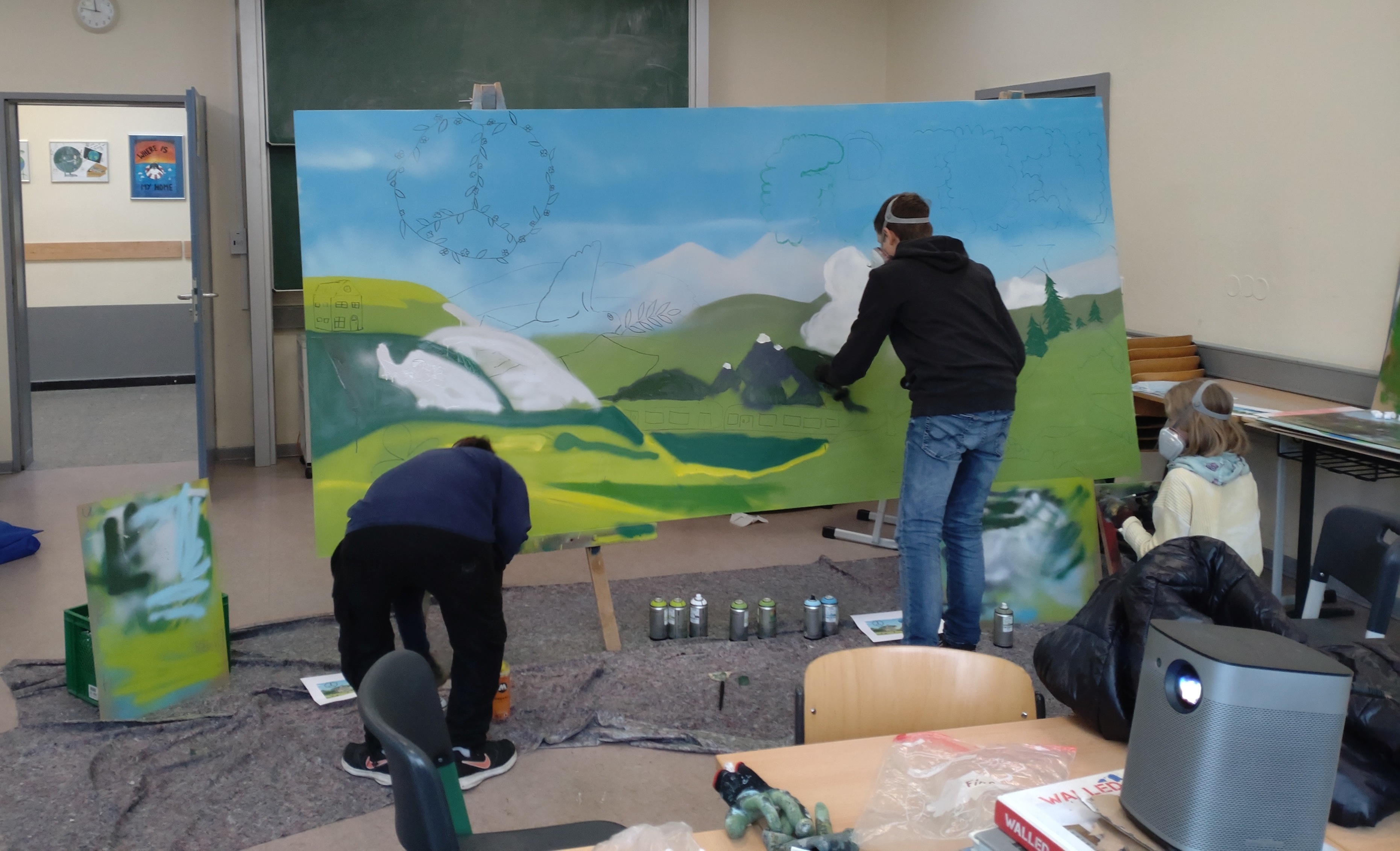 Nach einer ersten technischen Einführung im Umgang mit der Sprühdose, sammelte die Gruppe zunächst Ideen zum Thema „Europäisches Jahr der Jugend“ auf einer Sprühplatte. Am zweiten Workshop-Tag begannen die Teilnehmerinnen und Teilnehmer ihre Ideen in erste Skizzen umzusetzen. Am Nachmittag arbeiteten die Schülerinnen und Schüler dann zum ersten Mal mit den Sprühdosen an der Umsetzung. Am dritten und letzten Workshop-Tag entstanden die eigentlichen Kunstwerke. Sie wurden auf Alu-Dibond-Platten gesprüht, so dass diese dann später an einer gut sichtbaren Stelle platziert werden können.