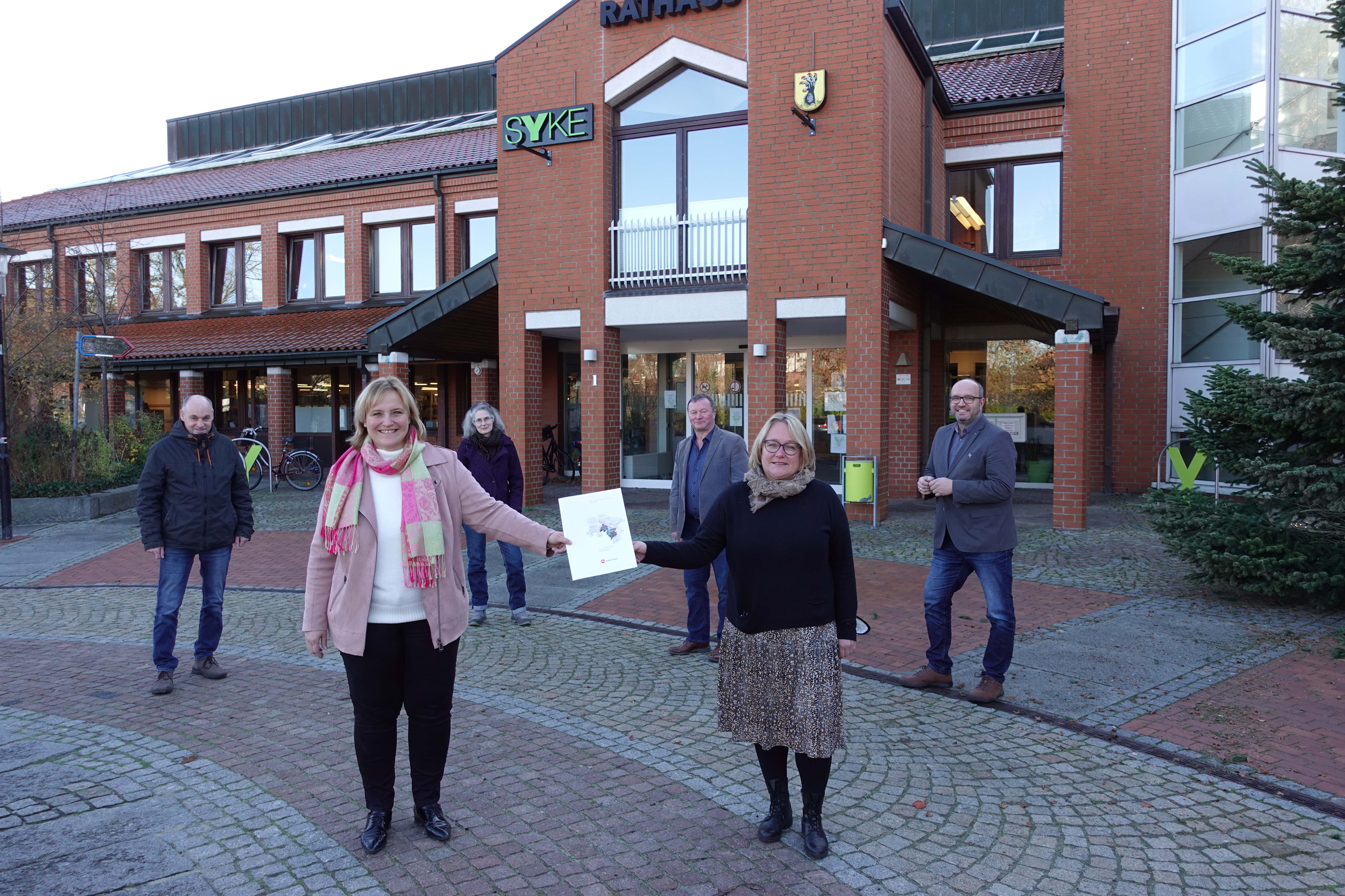HILDESHEIM/SYKE. – Die Bahnhofstraße in eine attraktive Achse zwischen Bahnhof und Innenstadt zu verwandeln und zugleich auch die gesamte Umgebung neu zu ordnen und aufzuwerten, das wird nun in Syke möglich. Mit 167.000 Euro unterstützt die Städtebauförderung diese Erneuerungsmaßnahme im Jahr 2021. Einen entsprechenden Förderbescheid überreichte am heutigen Montag, 22. November 2021, Dinah Stollwerck-Bauer, Landesbeauftragte für regionale Landesentwicklung Leine-Weser, an Bürgermeisterin Suse Laue.