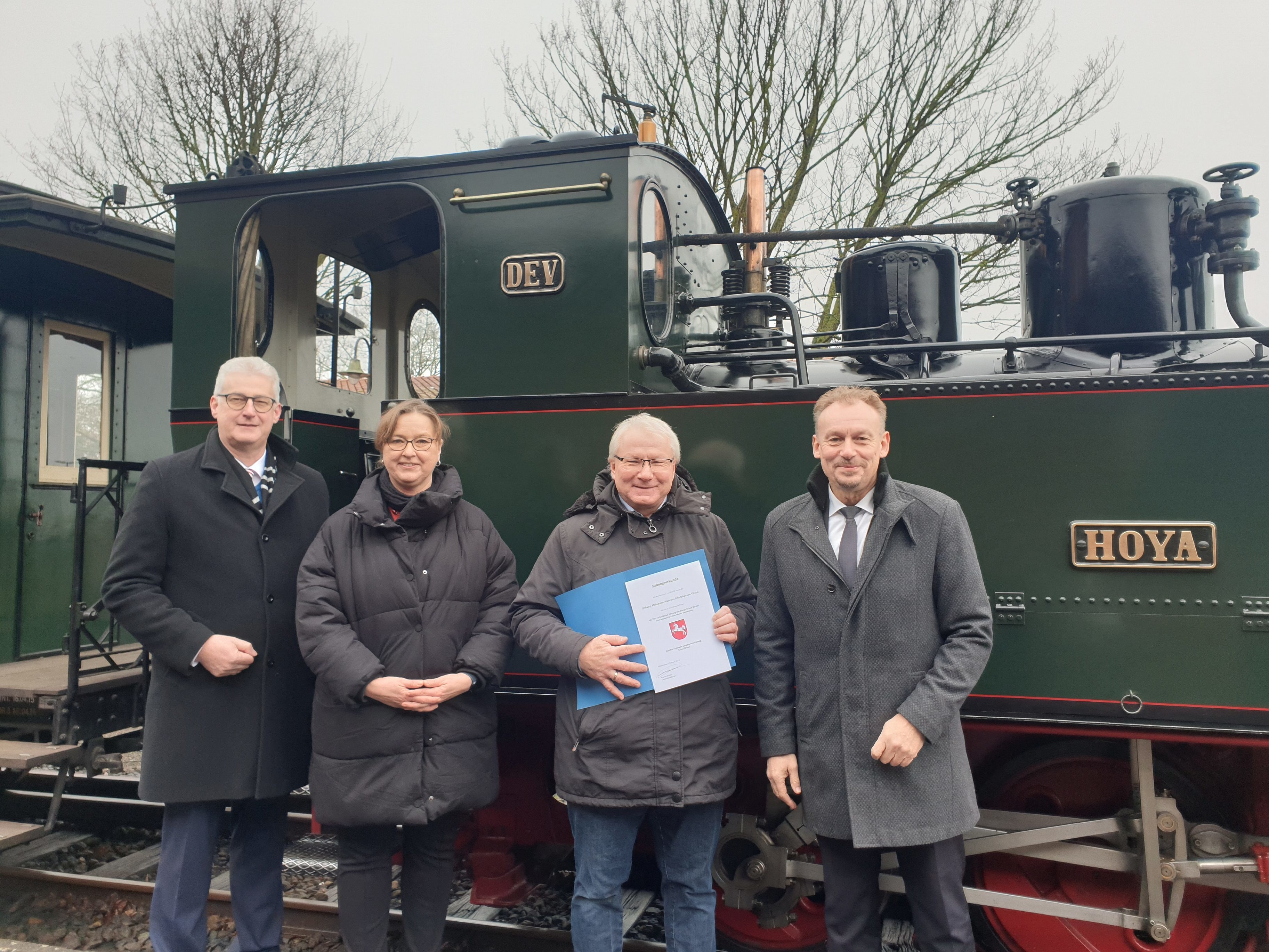 v.l.: Cord Bockhop (Landrat LK Diepholz), Landesbeauftragte Frauke Patzke (ArL Leine-Weser), Eckhard Thurau, Vorstandsvorsitzender Stiftung Kleinbahn-Museum Bruchhausen-Vilsen, Bernd Bormann, Samtgemeindebürgermeister Bruchhausen-Vilsen
