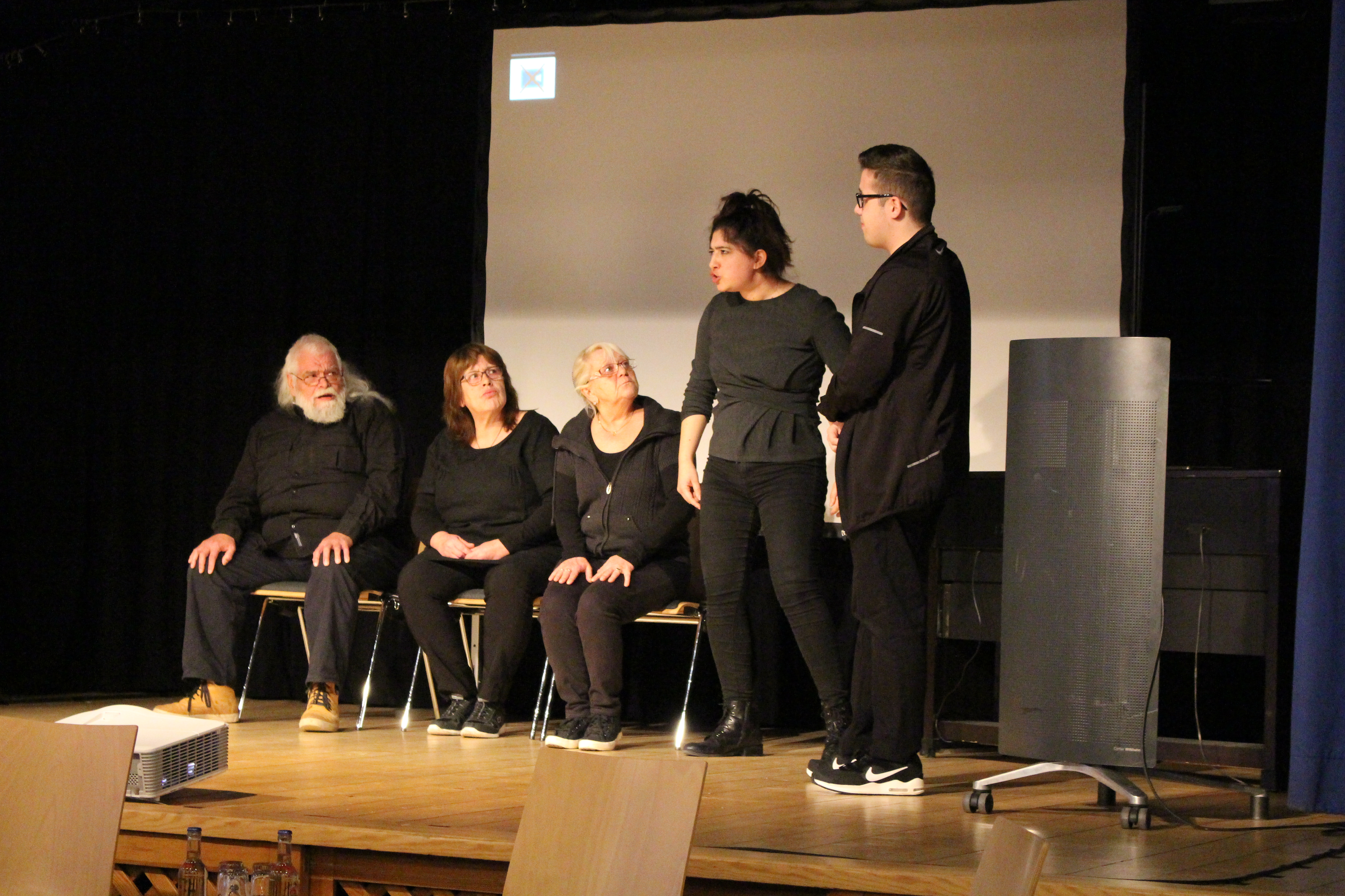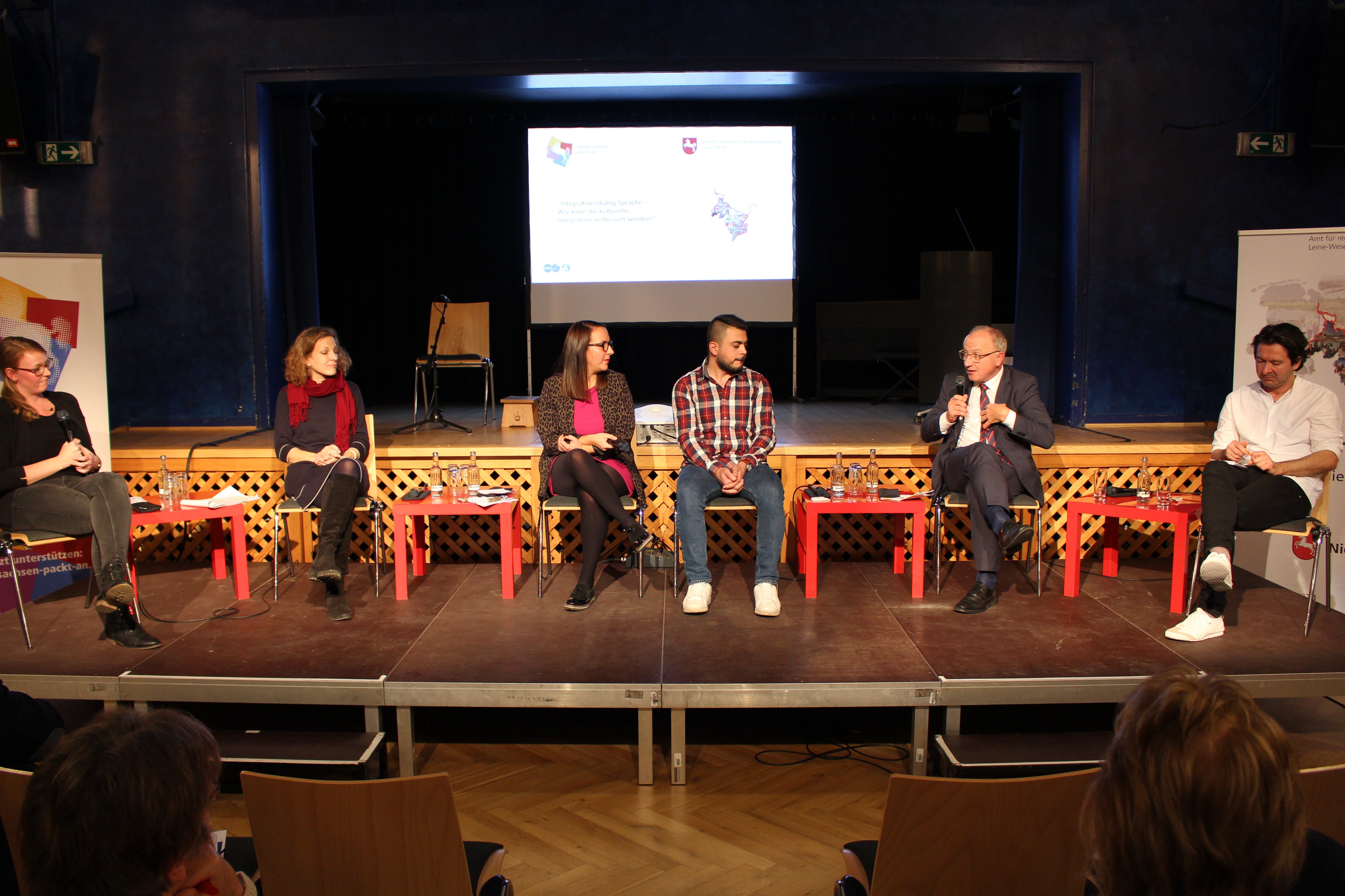 In der anschließenden Podiumsdiskussion berichtete zunächst die Integrationsbeauftragte der Stadt Stadthagen, Marlen Stryj von ihrer Arbeit und ihrem Ziel die Vernetzung der Migranten untereinander aber auch mit der Gesellschaft zu fördern. Katharina Schepker von der Agentur für Erwachsenen- und Weiterbildung berichtete von den Fördermöglichkeiten von Sprachkursen zur gesellschaftliche/kulturellen Teilhabe. Die bisherigen Erfahrungen seien ausgesprochen positiv, obwohl manche am Anfang zweifelten, wieso zum Beispiel Musik beim Erlernen der deutschen Sprache helfe. Abdul Raouf Androun aus Syrien, der beim Kulturzentrum Alte Polizei und als Schulbegleiter arbeitet, erzählte von seinen Integrationsbemühungen und Erfolgen in den vergangenen drei Jahren. Das Publikum beteiligte sich lebhaft an der darauffolgenden Diskussion und brachte eigene Erfahrungen der Diskriminierung, aber auch der erfolgreichen Integration, mit ein.