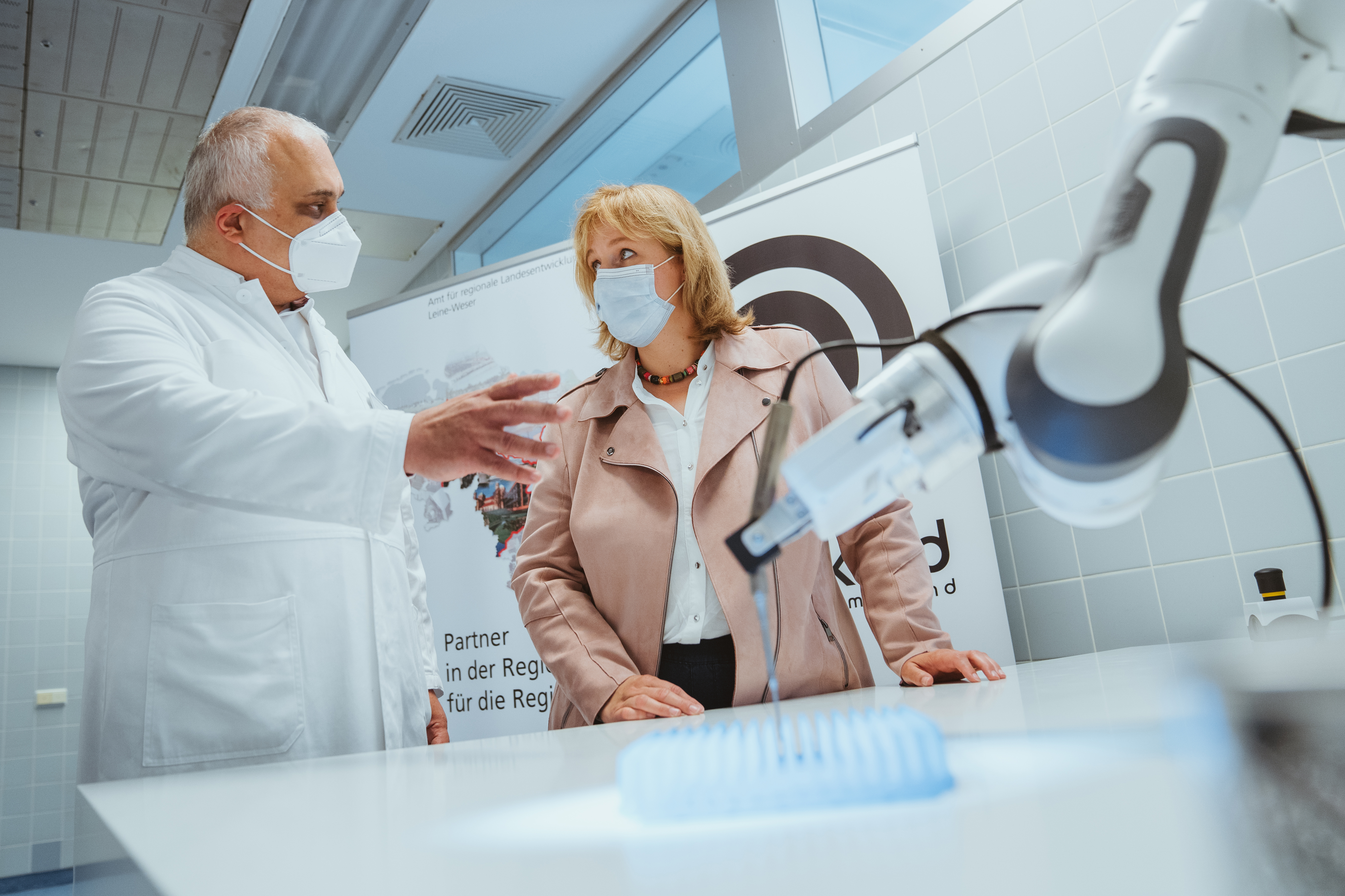 In Hannover besuchte die Landesbeauftragte anschließend die Robonatives Initiative der Robokind Stiftung, wo sie von der Stiftungsrätin und Projektleiterin Dr. Jasmin Grischke empfangen wurde. Bei einem Rundgang, auch in Begleitung von Prof. Dr. Arya Nabavi, Chefarzt der Klinik für Neurochirurgie am KRH Klinikum Nordstadt, durch die Laborräume des neu gegründeten Zentrums für Robotik im Gesundheitswesen hatte Dinah Stollwerck-Bauer dann die Gelegenheit die Arbeit an und mit den Robotern zu erleben. In der Region war das Dorfgemeinschaftshaus Bredenbeck in Wennigsen die nächste Station. Über 9.000 Arbeitsstunden seien hier in eineinhalb Jahren in die Umbauphase eingeflossen, berichteten die Vorstandsvorsitzenden des Dorfgemeinschaftsvereins, Thomas Behr und Rainer Hahne. Stollwerck-Bauer lobte den großen Einsatz: "Solche Orte des Treffens, Miteinanders und Gestaltens sind ganz wichtig. Unsere Orte leben durch Vereine wie diesen hier, der das alles auf die Beine gestellt hat." Die Landtagsabgeordnete Kerstin Liebelt pflichtete ihr bei. Neben weiteren Vertretern des Vereins waren auch die Ortsbürgermeisterin von Bredenbeck, Marianne Kügler, sowie Michael Beermann, stellvertretender Bürgermeister der Gemeinde Wennigsen, bei dem Ortstermin anwesend.