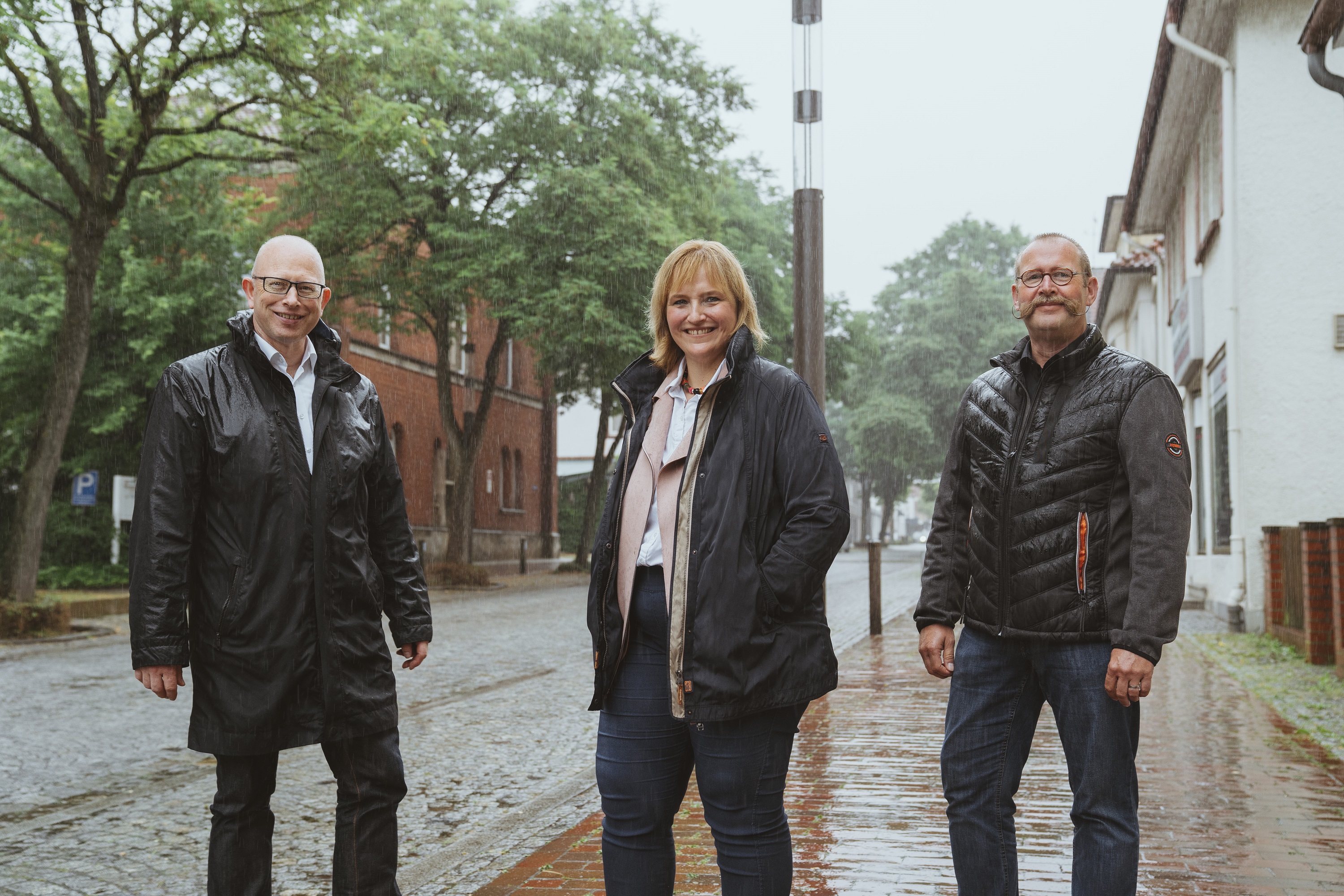Light the City Projekt in Sulingen (v.l.): Dirk Rauschkolb (Bürgermeister Stadt Sulingen), Dinah Stollwerck-Bauer (Landesbeauftragte) und Oliver Christen (OC-Lichtplanung)