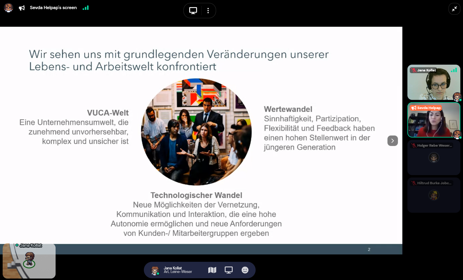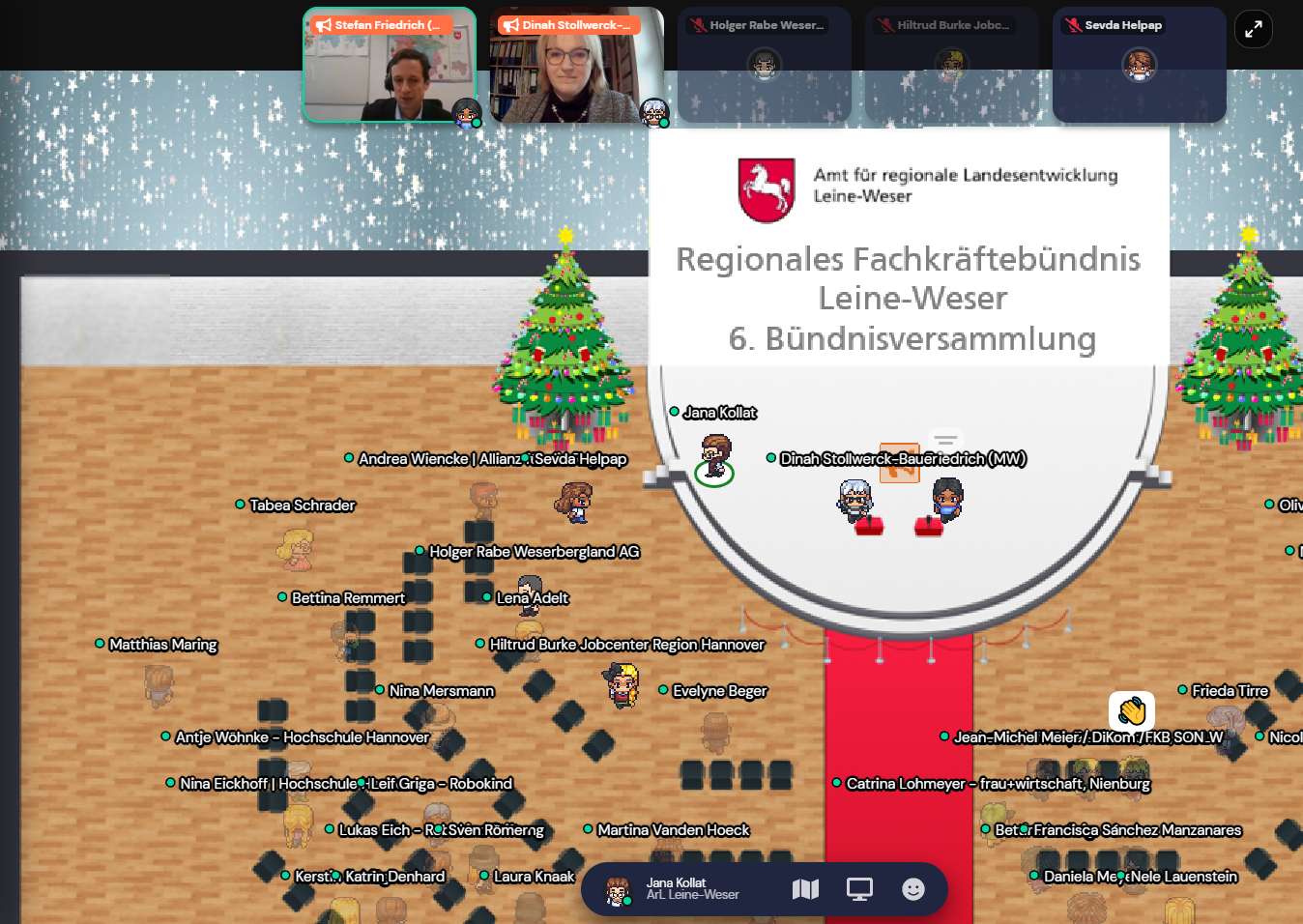 Anfang Dezember fand die sechste Bündnisversammlung des regionalen Fachkräftebündnisses Leine-Weser statt, um eine Jahresbilanz zu ziehen und die Verlängerung der Anerkennung als regionales Fachkräftebündnis 2021-2024 zu feiern. Das Regionale Fachkräftebündnis Leine-Weser unterstützt bereits seit 2015 Projekte zur innovativen Fachkräftegewinnung und -sicherung und vernetzt regionale Arbeitsmarktakteure. Aufgrund der aktuellen Corona-Lage wurde die Netzwerkkonferenz virtuell mit knapp 65 Teilnehmenden über Gather.town veranstaltet. Durch das Online-Tool bewegten sich die Teilnehmenden als Avatar. Sobald sich die Avatare einander näherten, konnten sie per Videotelefonie miteinander ins Gespräch kommen. Rückten die Gesprächspartner räumlich auseinander, schloss sich das Videotelefonie-Fenster, sodass sich immer wieder neue und flexible Gesprächsgruppen bildeten – ganz wie auf einer realen Konferenz.