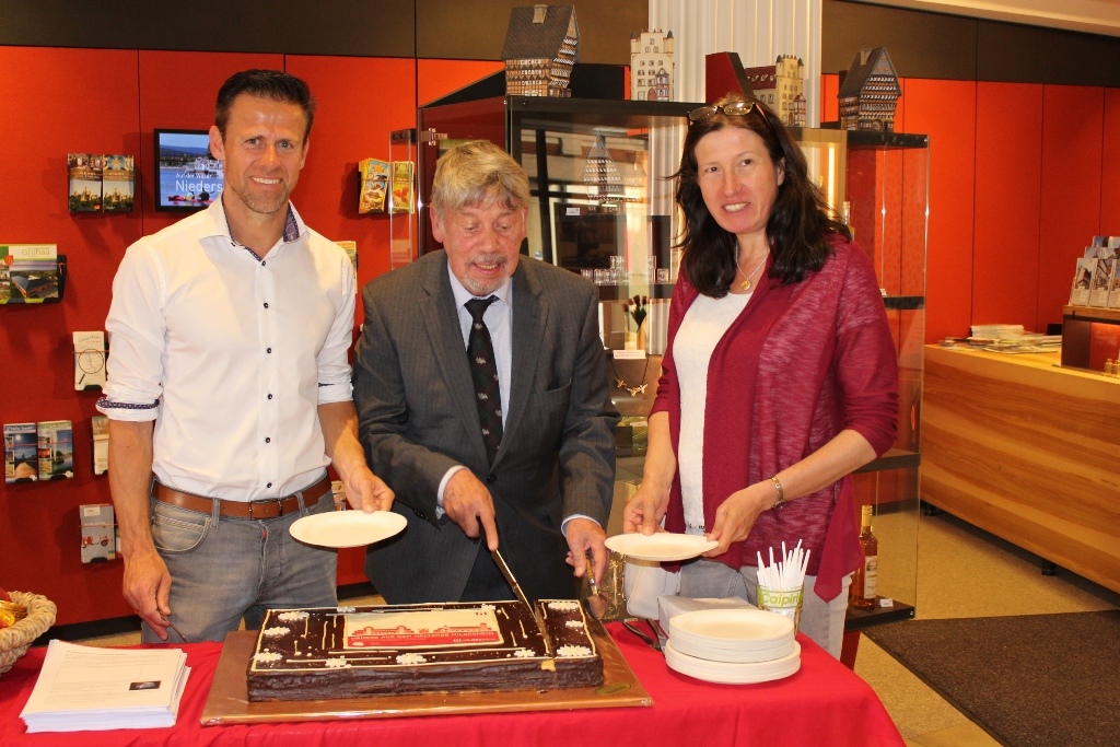 In Anbetracht der Aktion "Europa in meiner Region - Erfolgsgeschichten in Deutschland" ließen die Landesbeauftragte für regionale Landesentwicklung Leine-Weser, Karin Beckmann gemeinsam mit dem Geschäftsführer der Hildesheim Marketing Boris Böcker Luftballons mit Grüßen nach Europa steigen und schnitten für die Gäste eine Torte an.