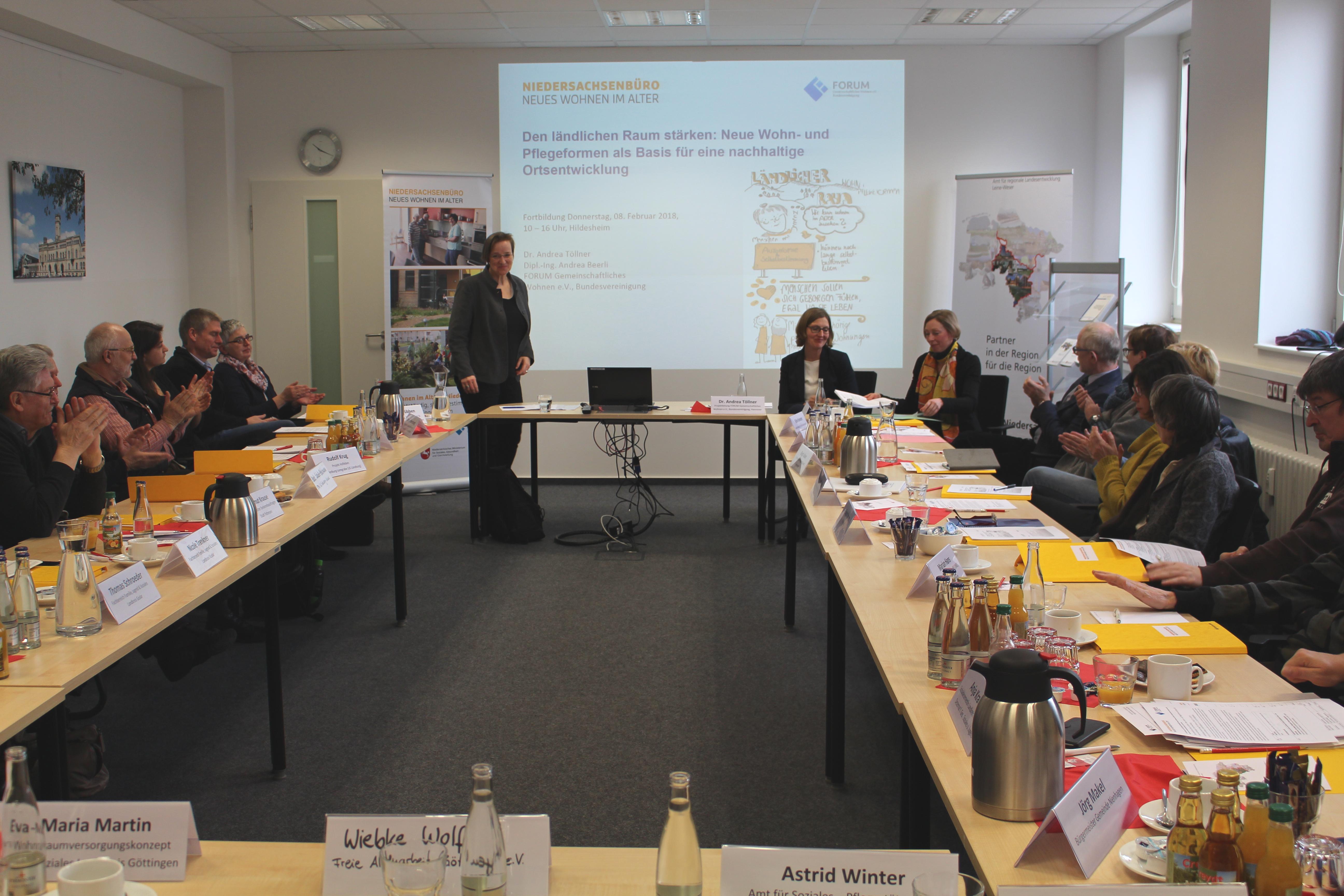 „Den ländlichen Raum stärken: Neue Wohn- und Pflegeformen als Basis für eine nachhaltige Ortsentwicklung“ – so lautete der Titel einer Fortbildung des Niedersachsenbüros Neues Wohnen im Alter. Die in Kooperation mit dem ArL Leine-Weser stattfindende Veranstaltung gab Antworten auf die Frage, wie auch im Alter und zum Nutzen des ländlichen Raumes „anders als gewohnt“ gelebt werden kann. Landesbeauftragte Heike Fliess begrüßte die Teilnehmer und auch das Thema der Fortbildung: „Das Thema „Wohnen im Alter“ bietet eine Vielzahl von Ansatzpunkten für innovative dörfliche Entwicklung. Das Engagement, das wir heute für die Rahmenbedingungen für das Leben im Alter aufbringen, wird auch für die künftigen älteren Generationen von Nutzen sein“.