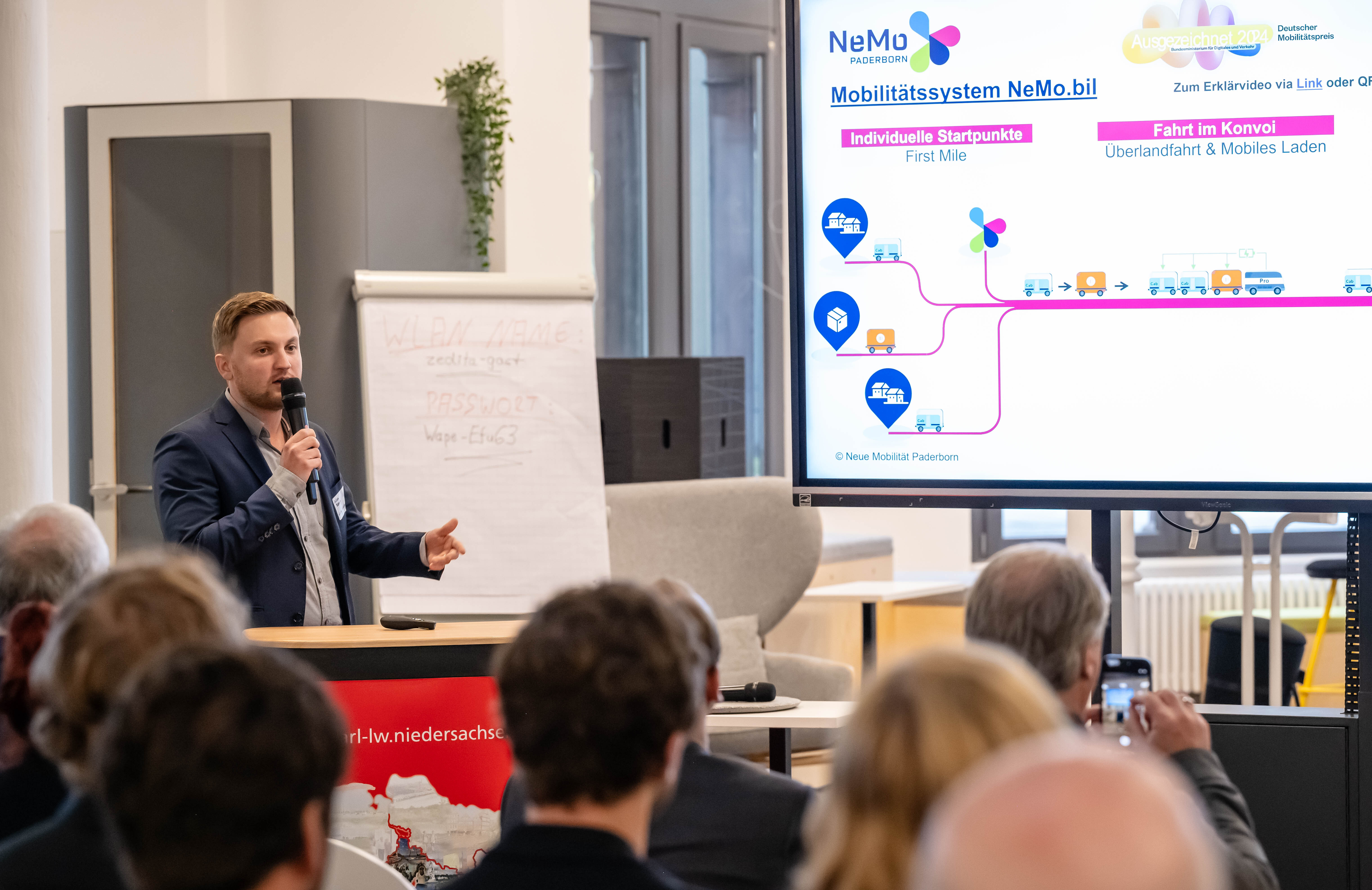 Ein Highlight des Vormittags war die Vorstellung von Best-Practice-Beispielen, wie das Projekt „Neue Mobilität Paderborn“ (NeMo Paderborn), ein innovatives Mobilitätskonzept, das darauf abzielt, die Verkehrsanbindung in ländlichen und suburbanen Gebieten zu verbessern. Im Mittelpunkt steht die Entwicklung und Erprobung flexibler, digital gesteuerter Mobilitätsangebote, die insbesondere die sogenannte „erste und letzte Meile“ – also den Weg von der Haustür zum nächsten Verkehrsknotenpunkt und umgekehrt – komfortabel und nachhaltig gestalten. NeMo Paderborn setzt dabei auf bedarfsgerechte, buchbare Shuttle-Dienste, die mit modernen Technologien wie App-Steuerung und Echtzeitdaten arbeiten.